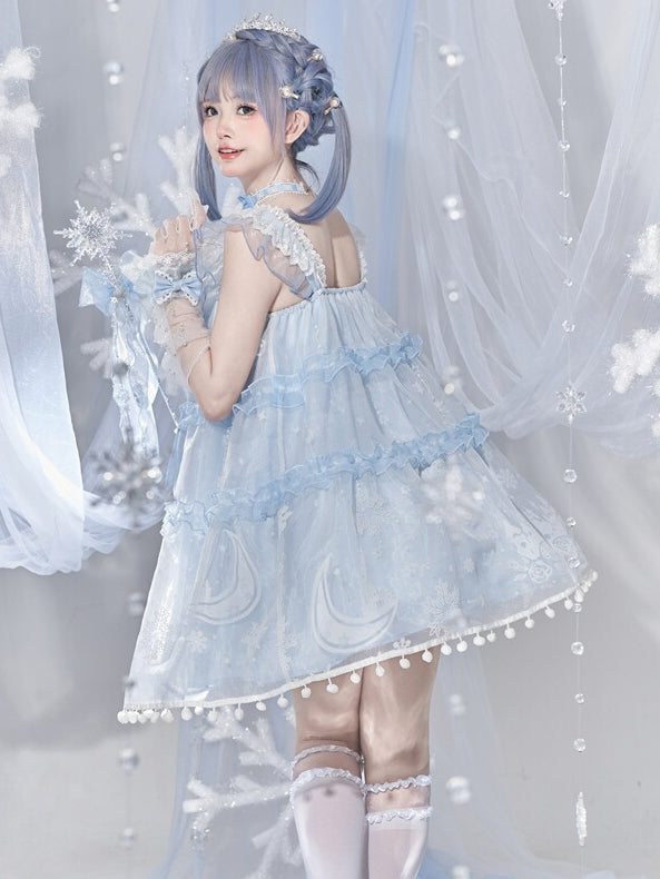 ライトブルーのスノームーンキャッスルオーバーレイポンポントリムドレススイートロリータジャンパースカート