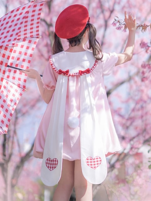 淡いピンクのうさぎ耳、ピーターパンカラー、そしてバブルスカートが特徴の、愛らしいドレスです。どんなお洋服にもキュートなアクセントを添えてくれます!