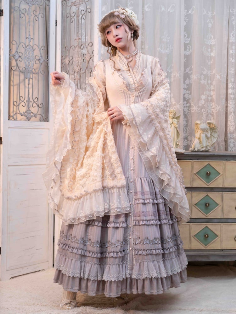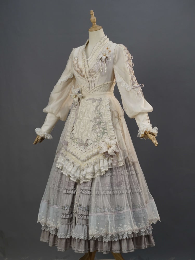 ユリの刺繍アップリケがあしらわれた、パープルのクラシックロリータドレス。フロントボタンのプラケットデザインが特徴で、全体にエレガントな雰囲気を添えています。裾のレイヤードと繊細な刺繍アップリケが、女の子らしい可愛らしさを演出し、キュートでフェミニンな一面を演出したい方にぴったりです。