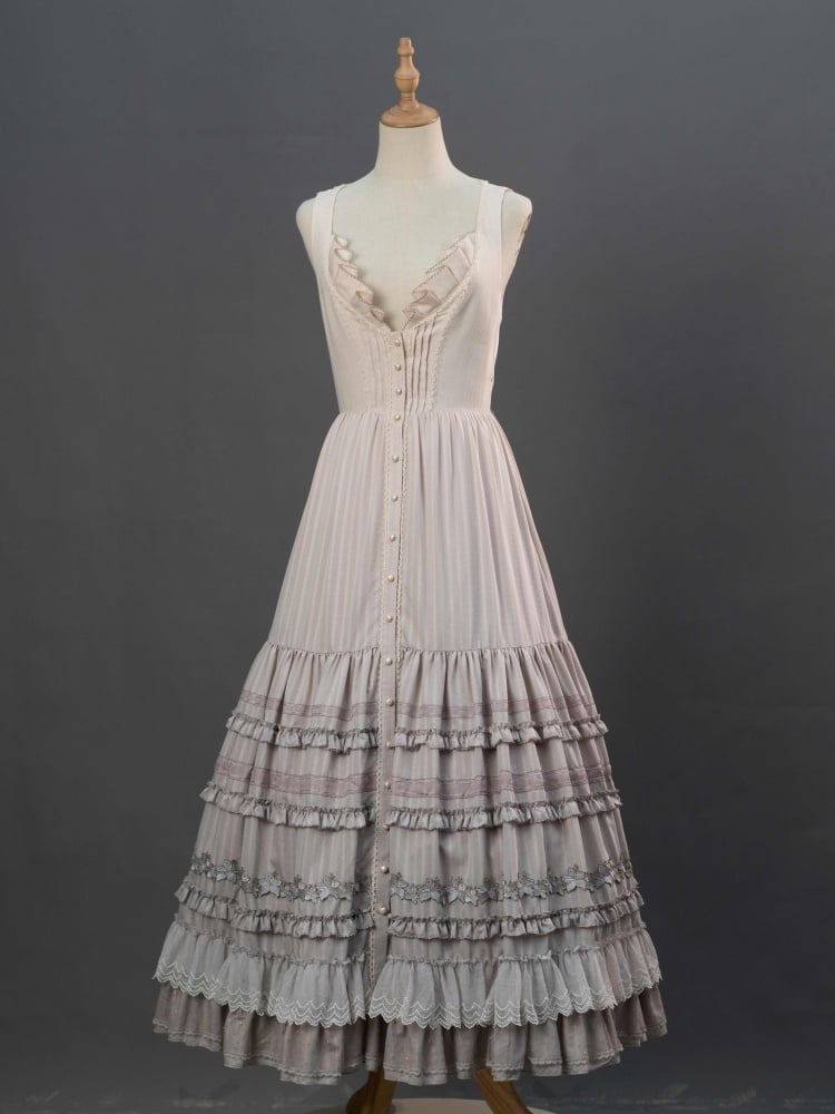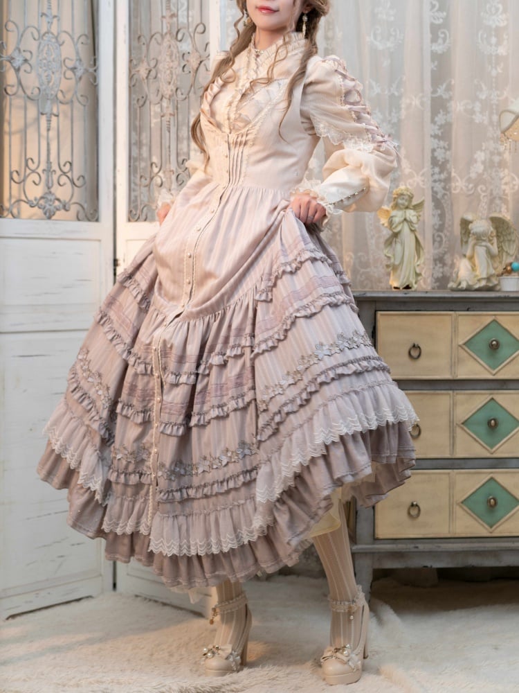ユリの刺繍アップリケレイヤードヘムパープルクラシックロリータドレスフロントボタンプラケット