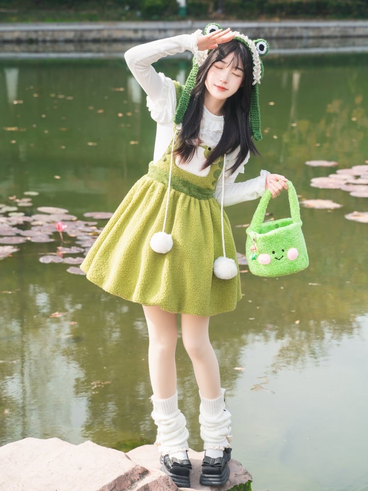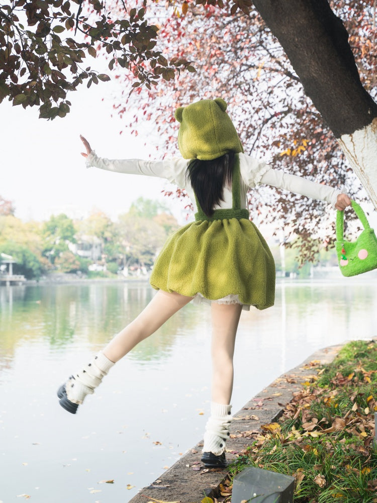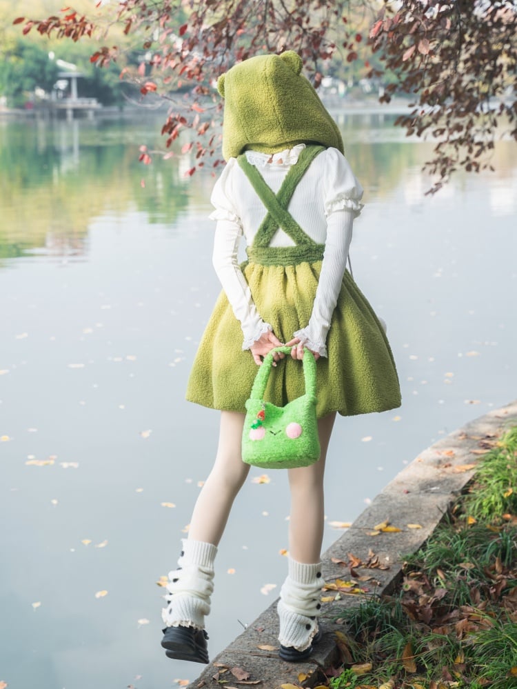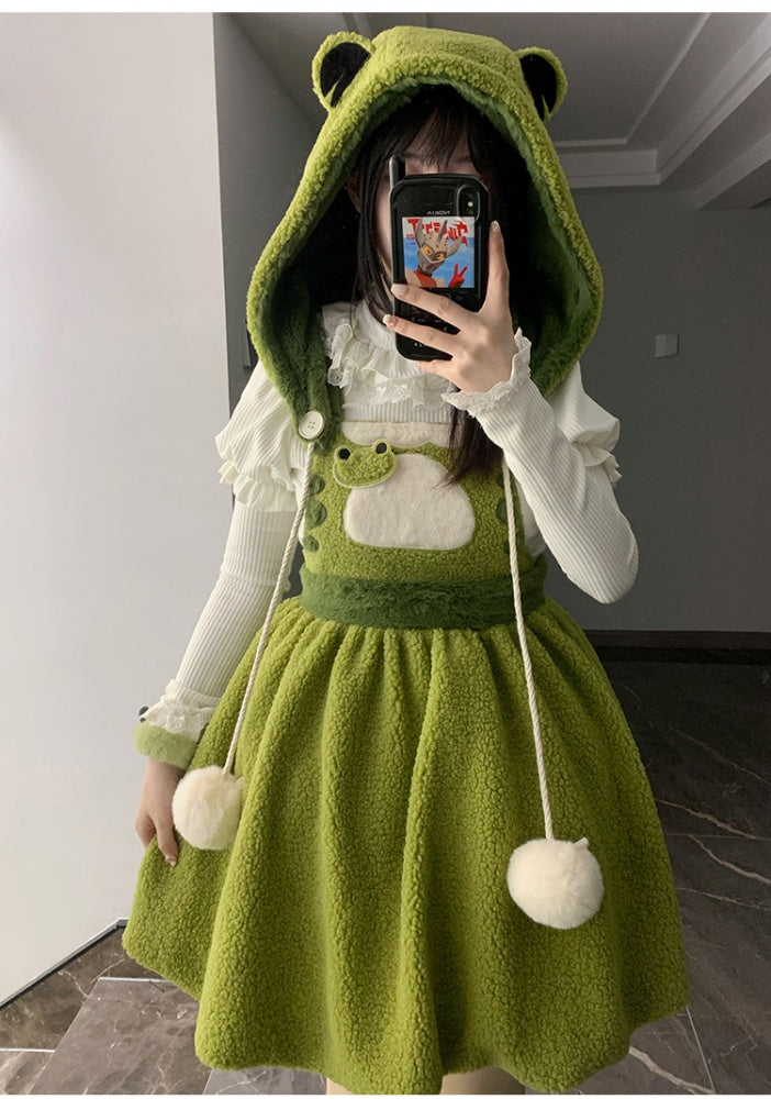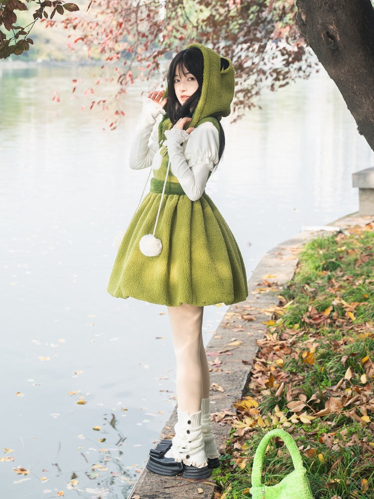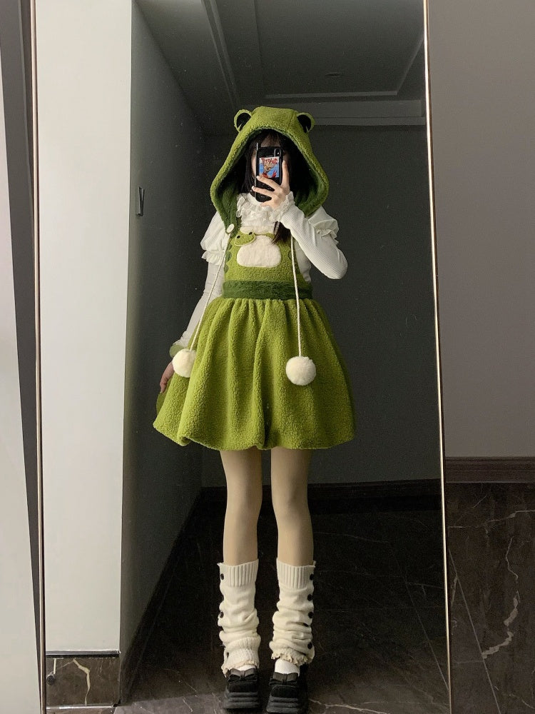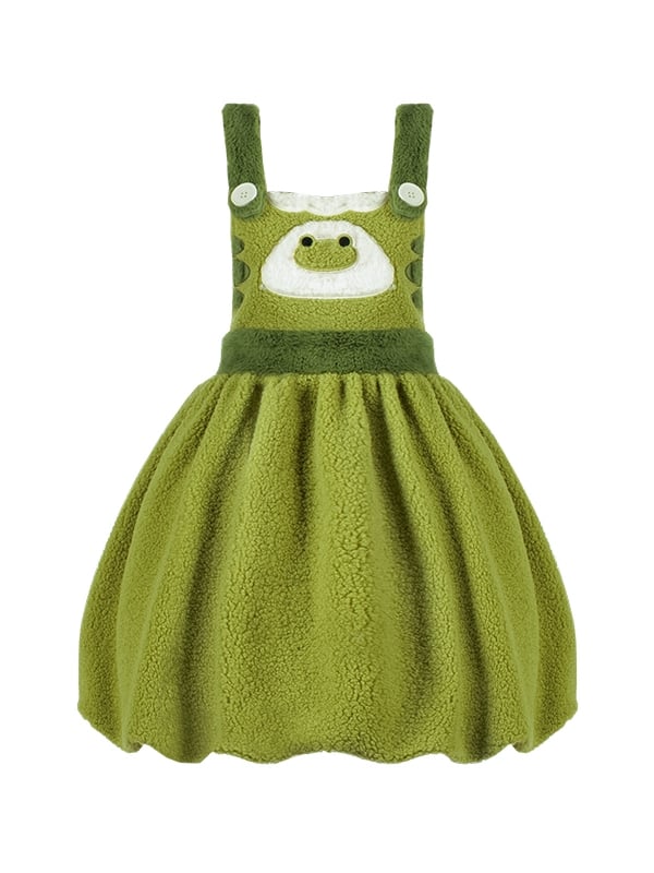 リトルフロッグ グリーン バブルスカート フリース 冬用オーバーオールドレス