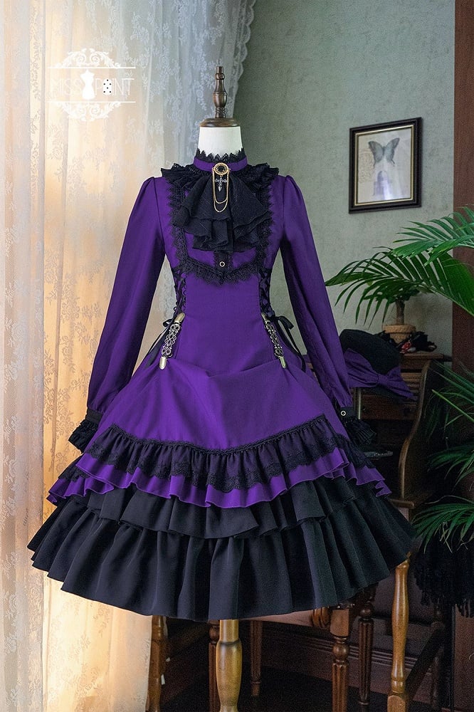 ゴシックロリータドレス(プチフリルカラー、ハイネック、6パネルボディス、レイヤードスカート)— 魔女っぽい4色