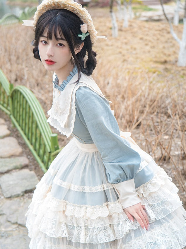 青と白のオールドスクールロリータファッションドレス 蝶結びディテール JSK セット