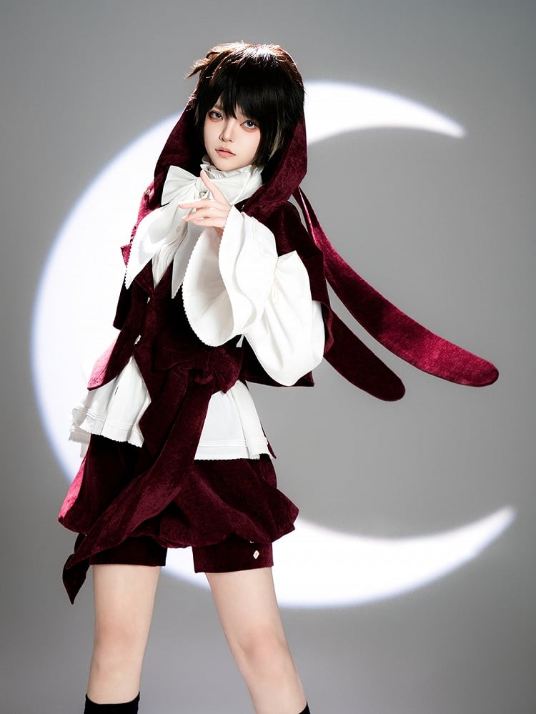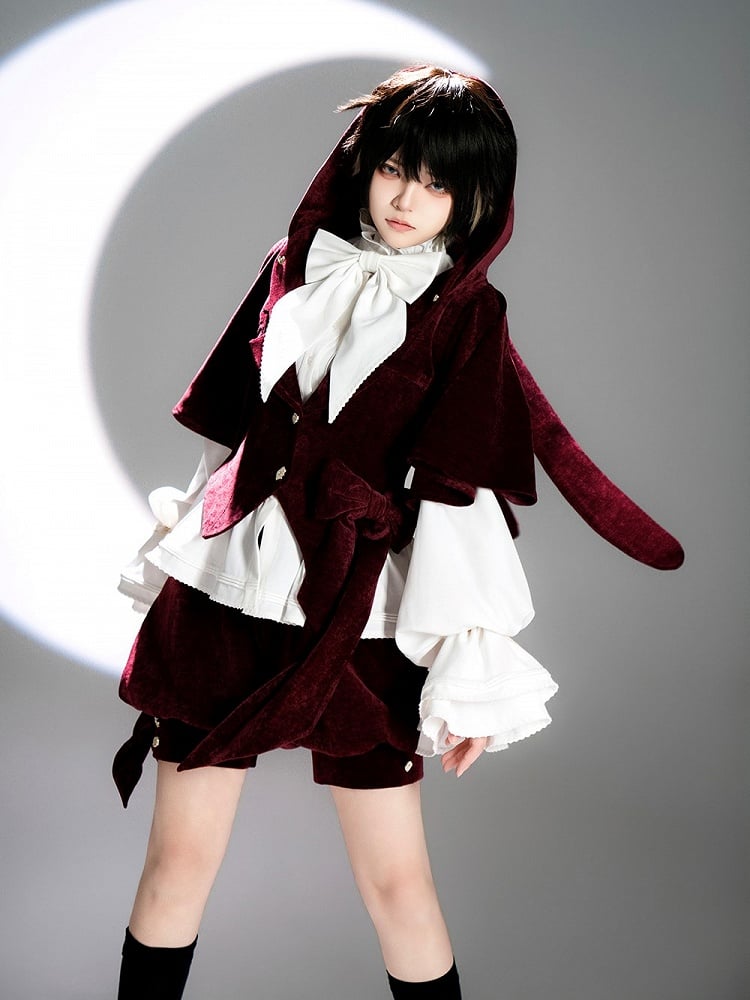 ワインレッド王子ロリータベルベットジャケット(特大うさぎ耳フード付き)