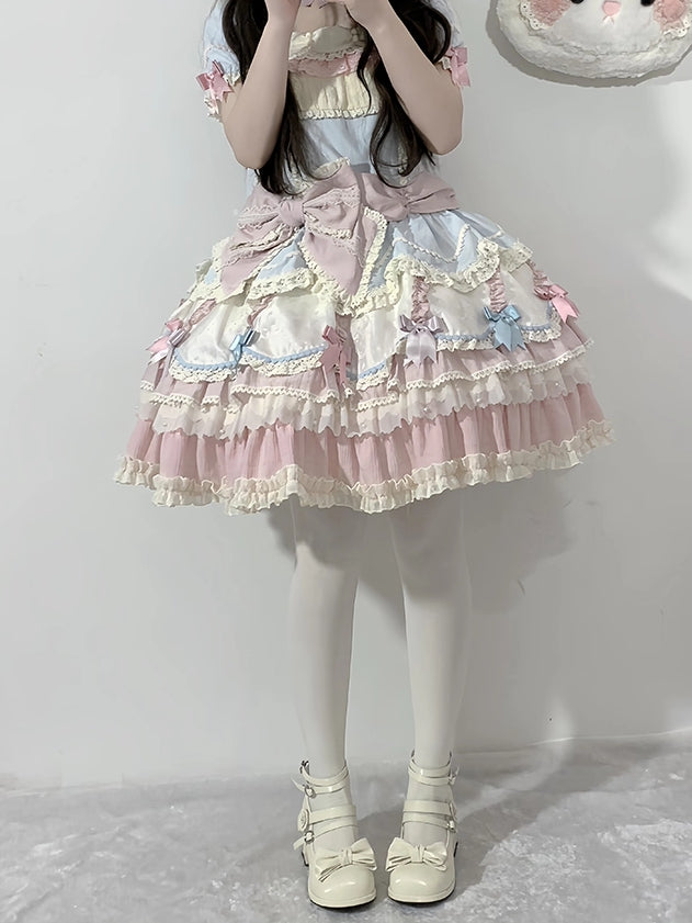 ピンクと白のオールドスクールロリータファッションドレス、蝶結びディテール、ロリータJSKセット