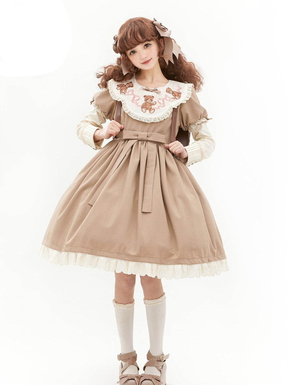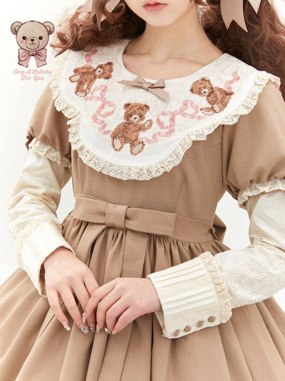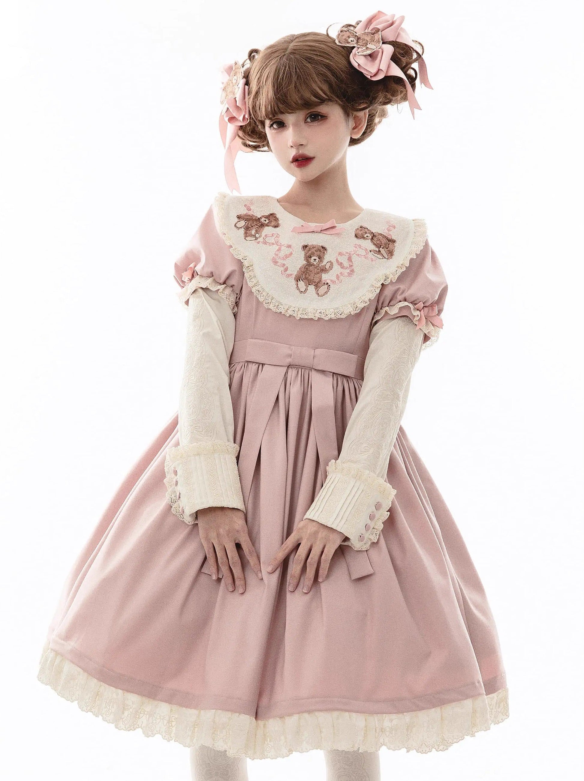 ロリータテディベアフラップレースパフスリーブリボンデレス