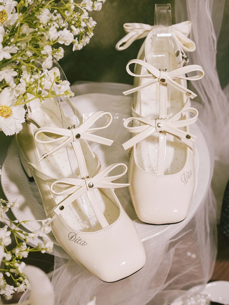 Polished White Elegant Lolita Square Toe Middle Heels with T-strap Design & Bow Accents