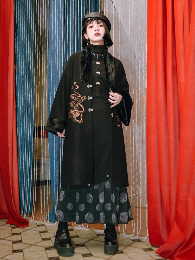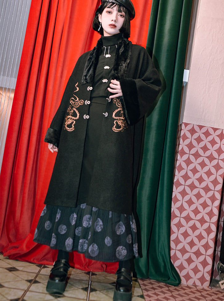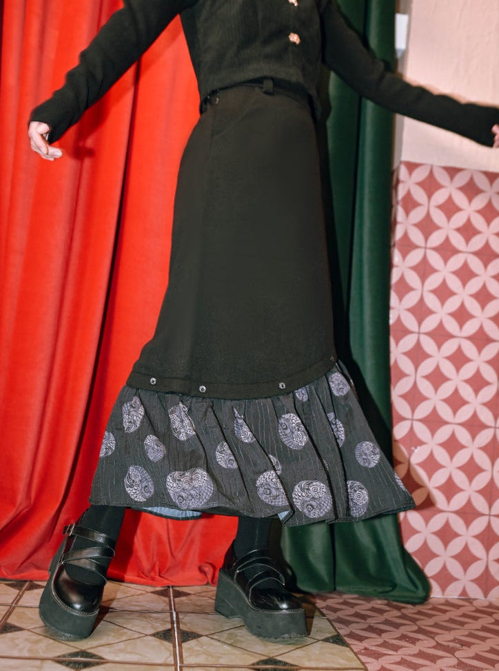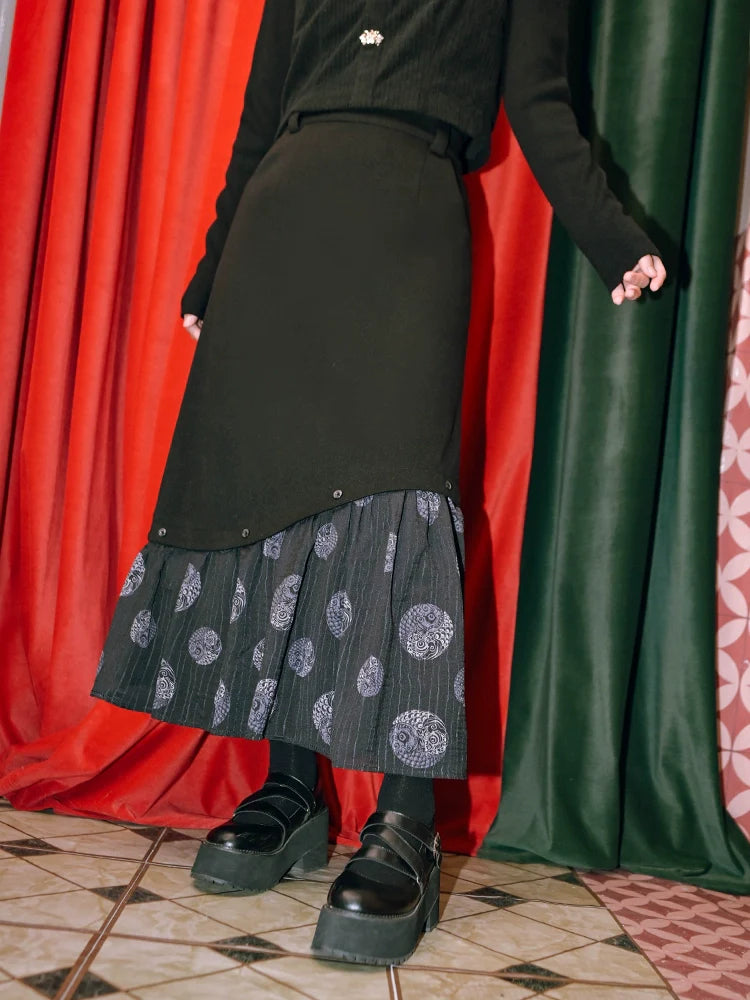ロングチャイナプラスプリントスカート スプライシングベルベットで、ワードローブにキュートなアクセントをプラス。柔らかなベルベット素材と個性的なプリントデザインが、着心地の良さとスタイリッシュさを両立したスカートです。