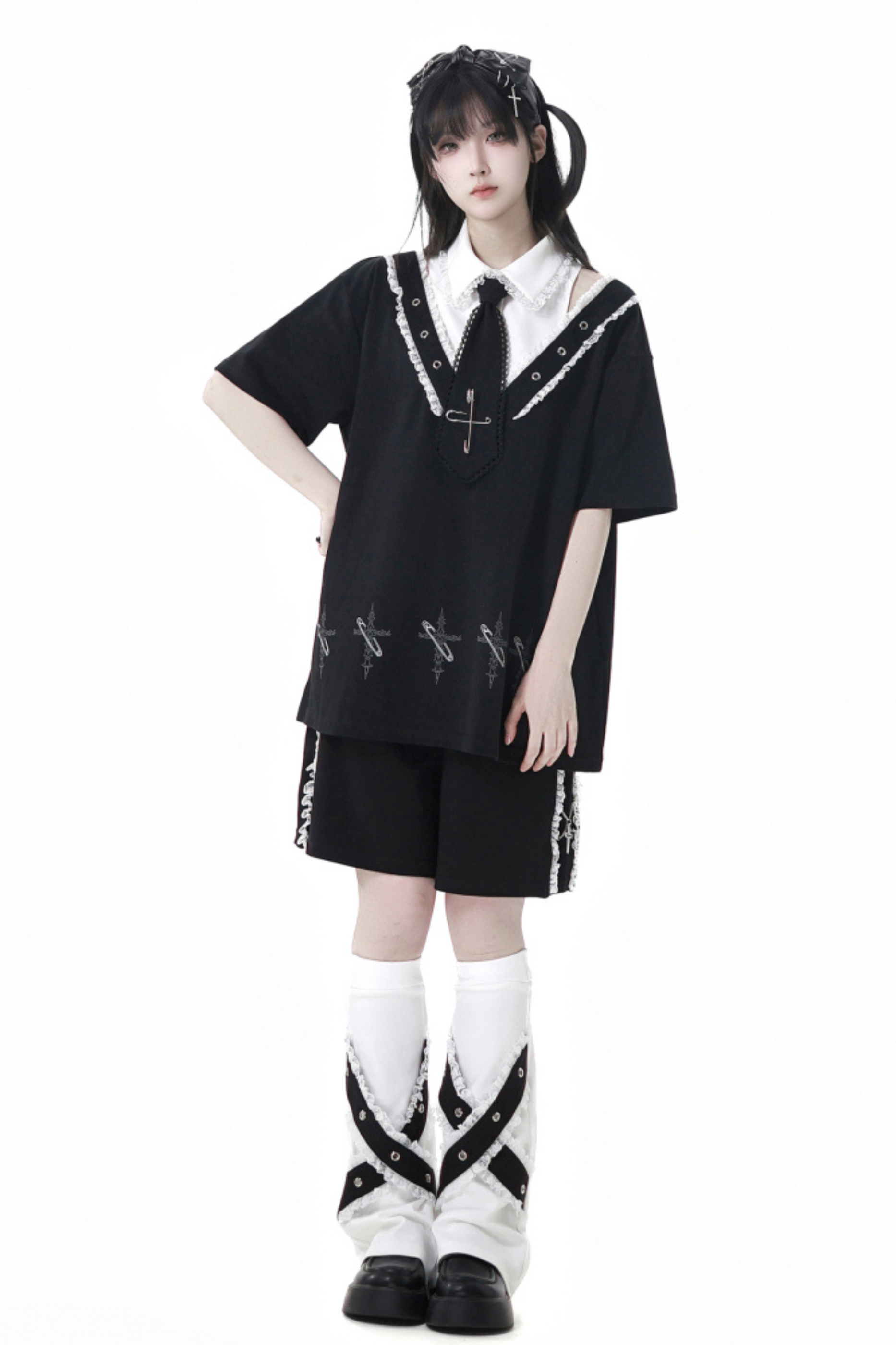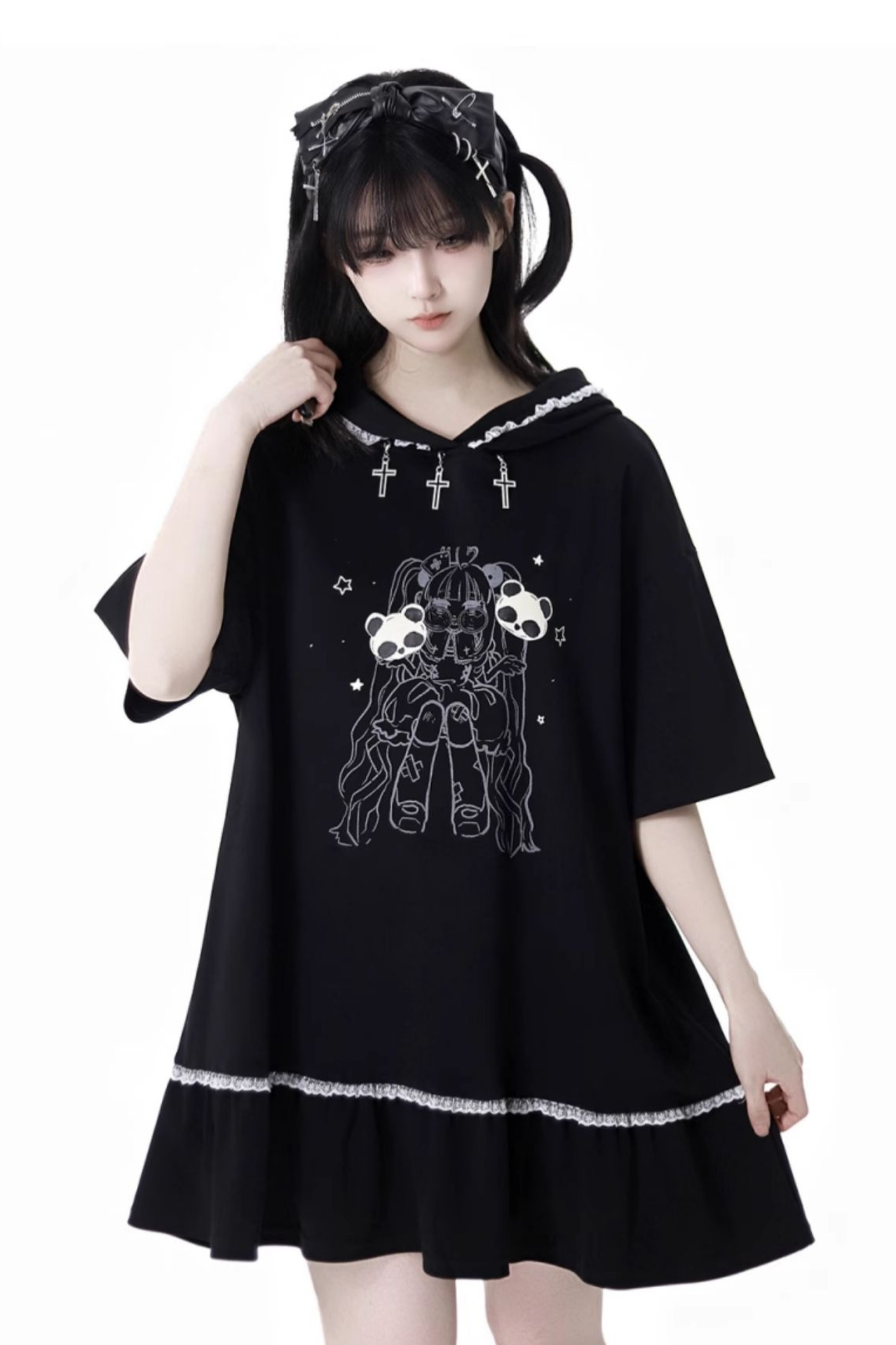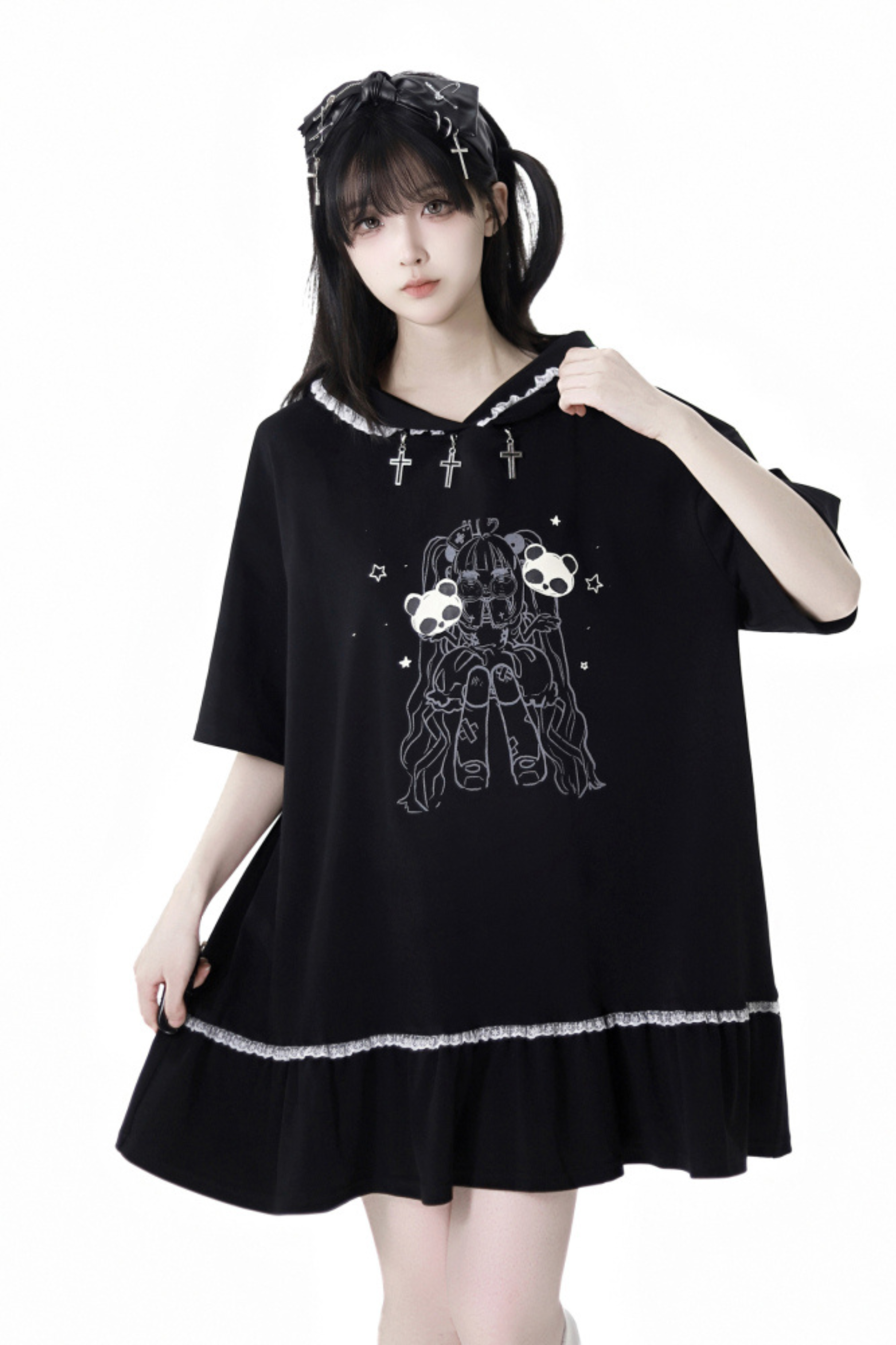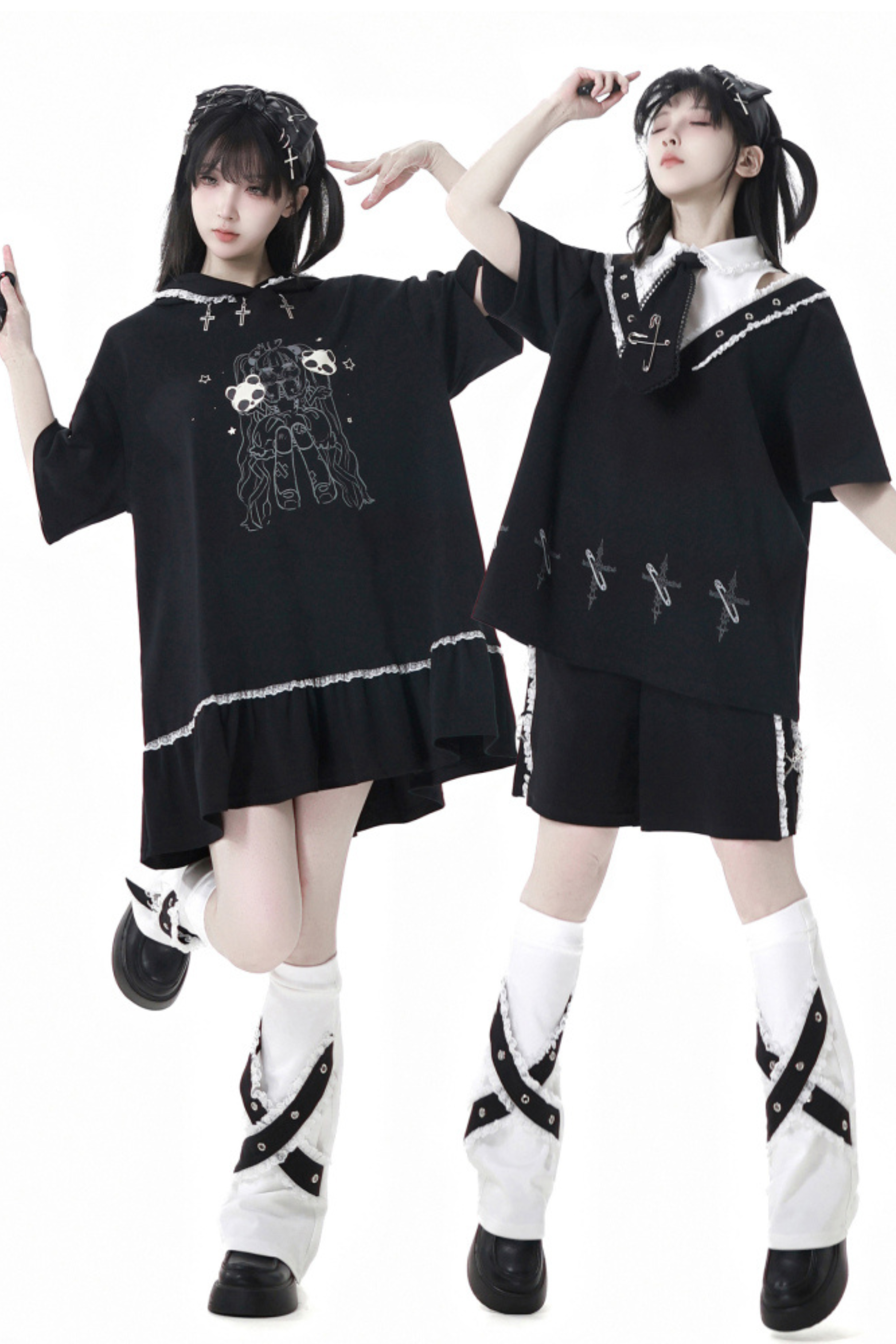 ❤フード付きフリルドレス + ネクタールーズトップ + ハーフパンツ + レッグウォーマー❤