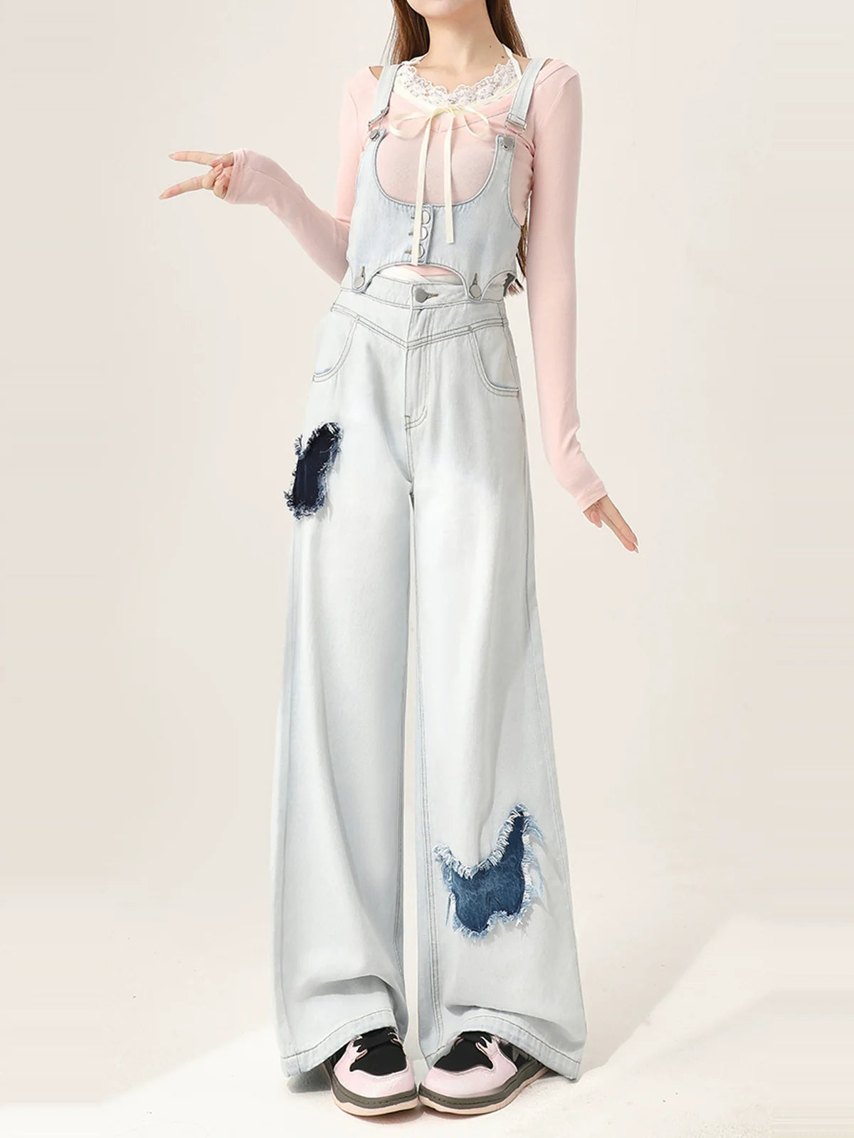 ルーズベストジーンズデニムオーバーオールデニムバタフライ+パッチ