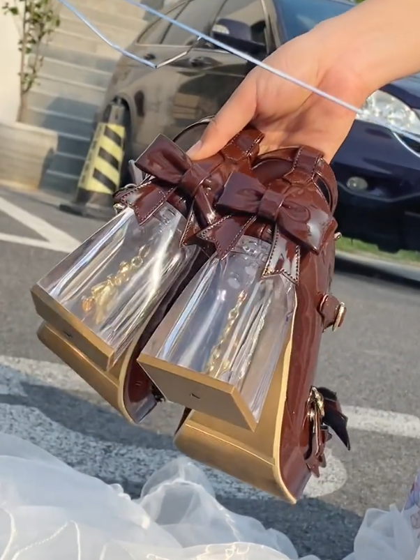 Lolita Brown Platform High -heel Mary Jane Shoes - Crisscross Details, Heart Buckle & Transparent Heel Featuring Bear Decor