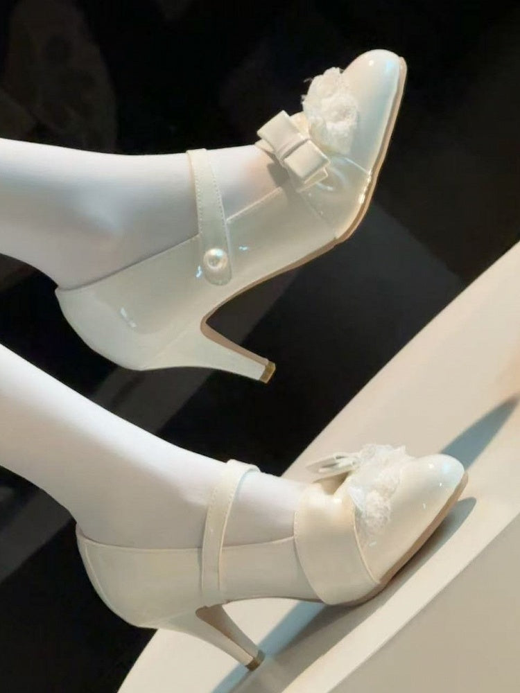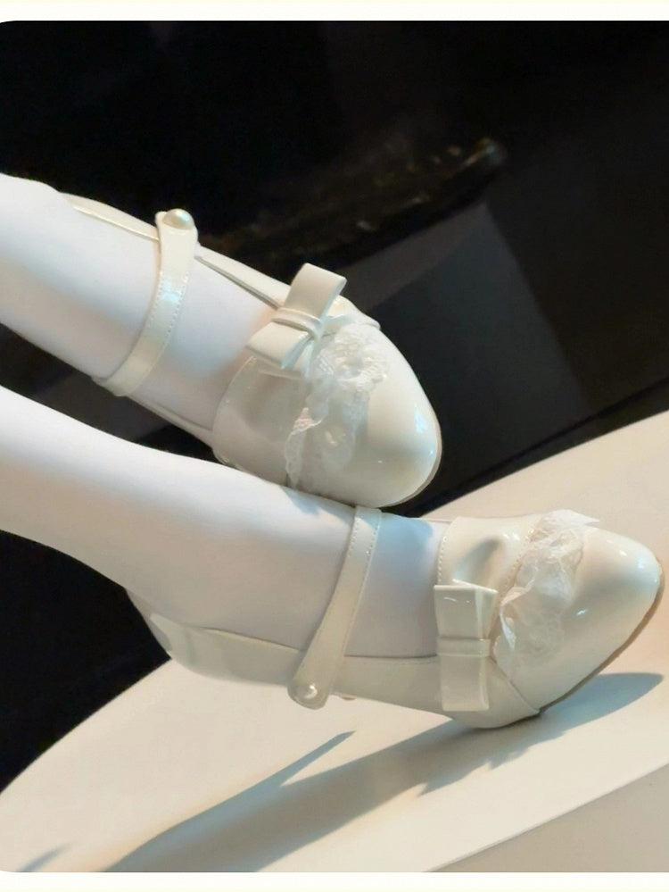 White Mary Jane Heels with Sweet Lolita Style - PU Leather, Top Bow, Detachable Lace and Beads DecorVelcro Strap Closures