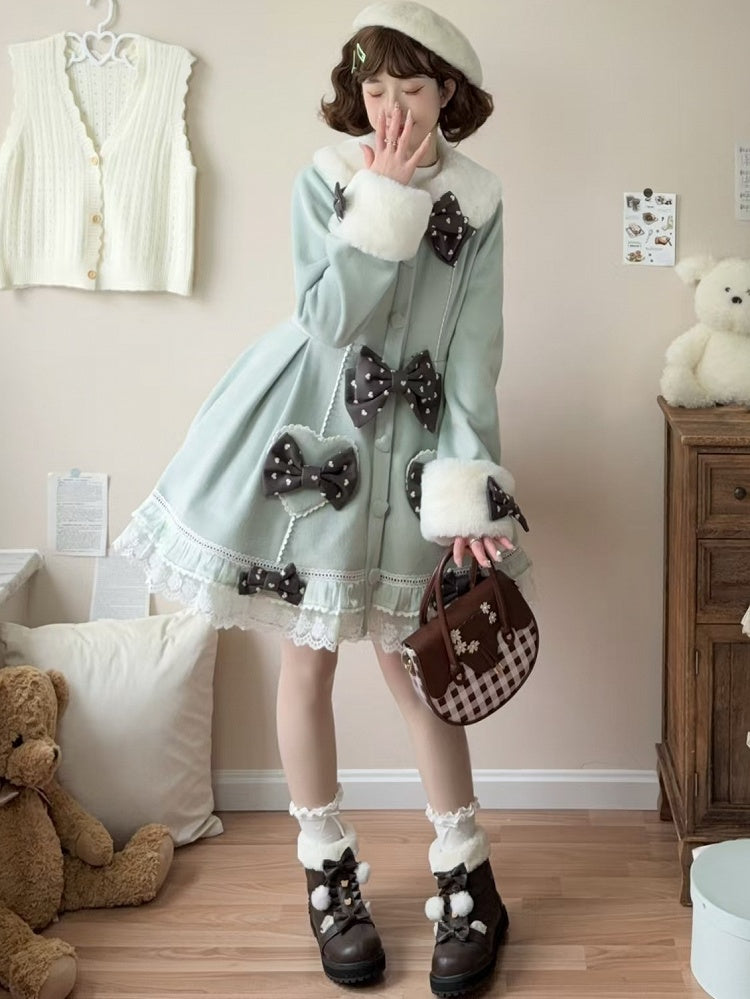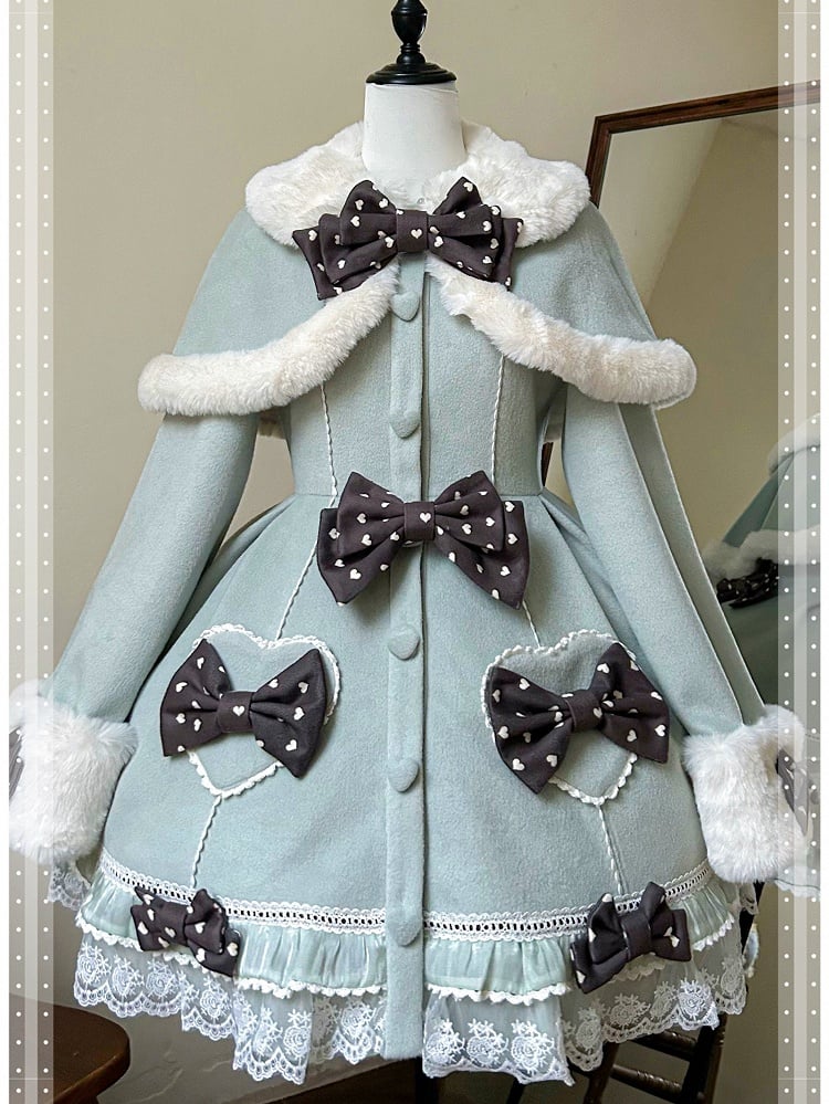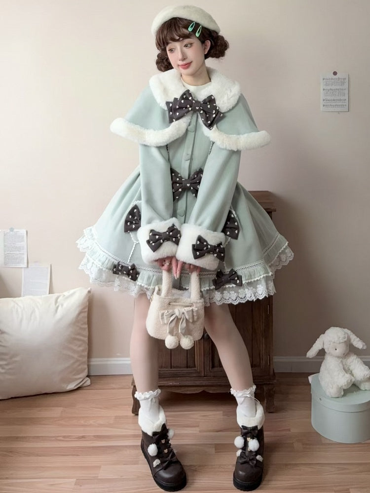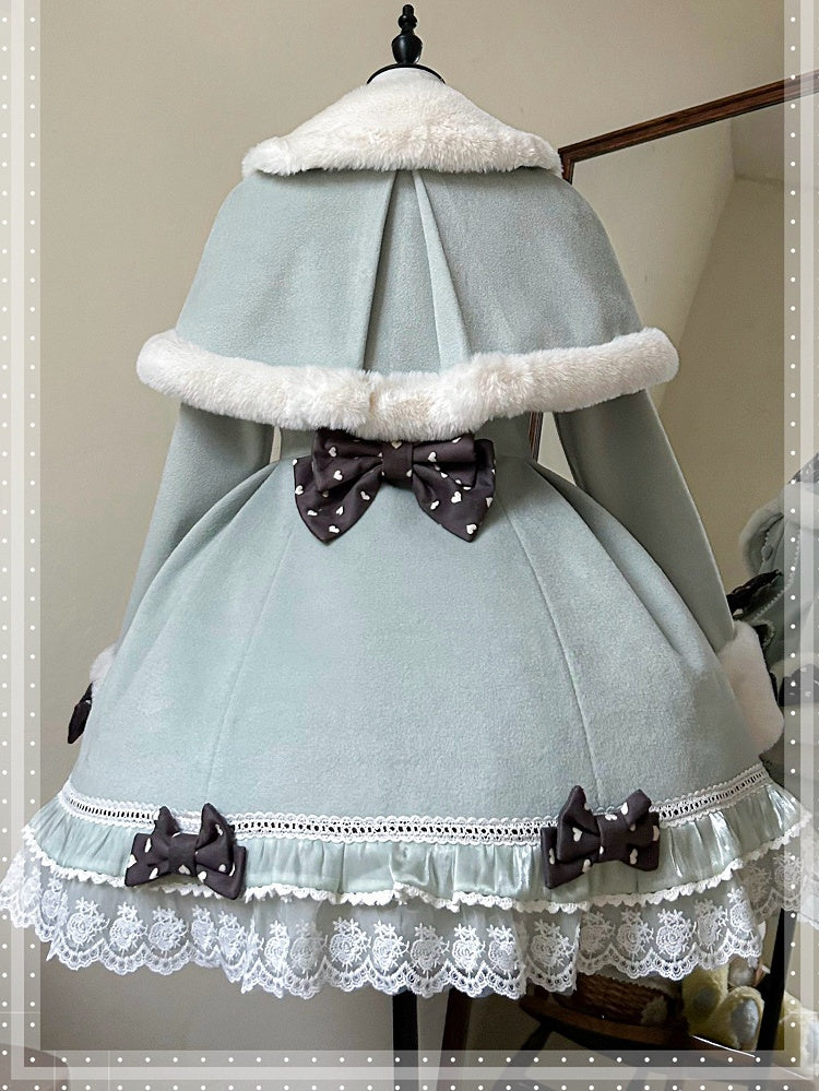 ミントグリーンのリボンがアクセントのケープロリータコート(レーストリム付き)