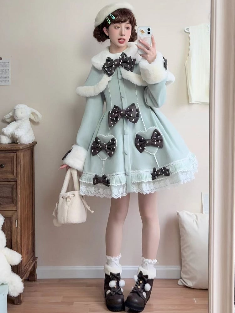 愛らしくチャーミングなミントグリーンのケープロリータコートは、どんな装いにもキュートなアクセントを添えてくれます。繊細なレースのトリムと愛らしいリボンのアクセントが特徴的なこのコートは、暖かさだけでなく、甘く個性的な雰囲気をあなたの装いに添えてくれます。流行に敏感なロリータにぴったりです。