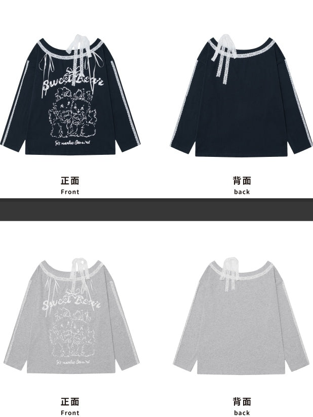 ネイビーブルーの漫画プリントレースアクセントアシンメトリーネックライントップス