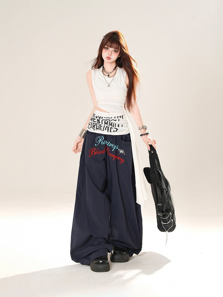 ネイビーブルーのドローストリングウエスト文字刺繍ワイドレッグカジュアルパンツ