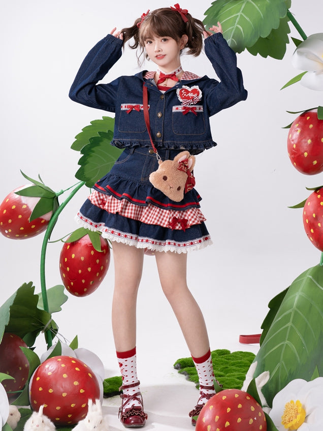 ネイビーブルーのハートアップリケ付きバニーイヤーフード付きデニムショートジャケット、フリルヘム