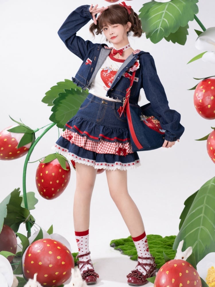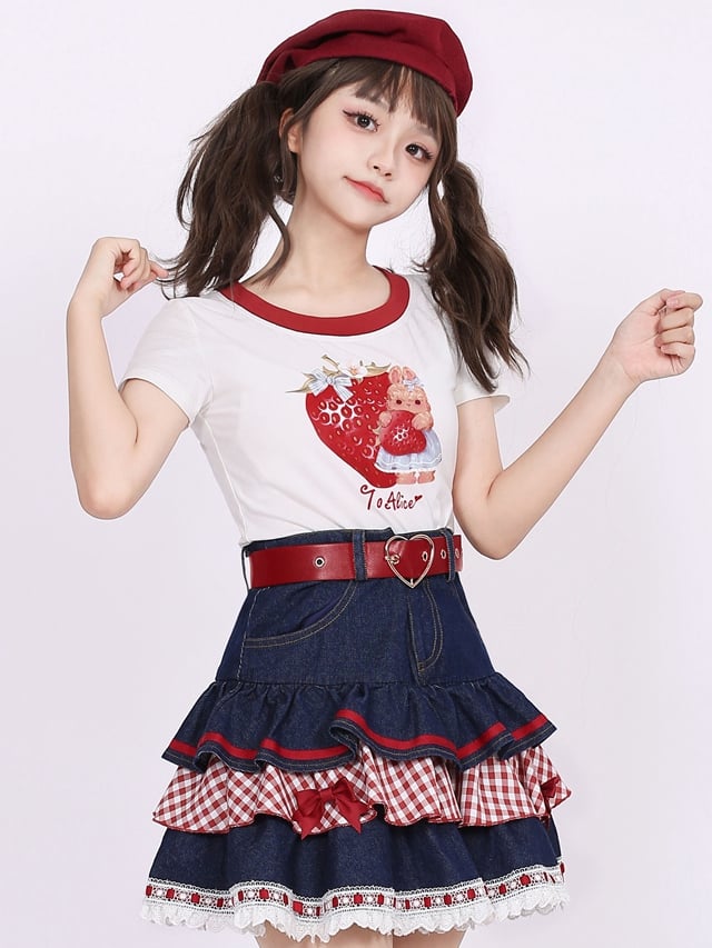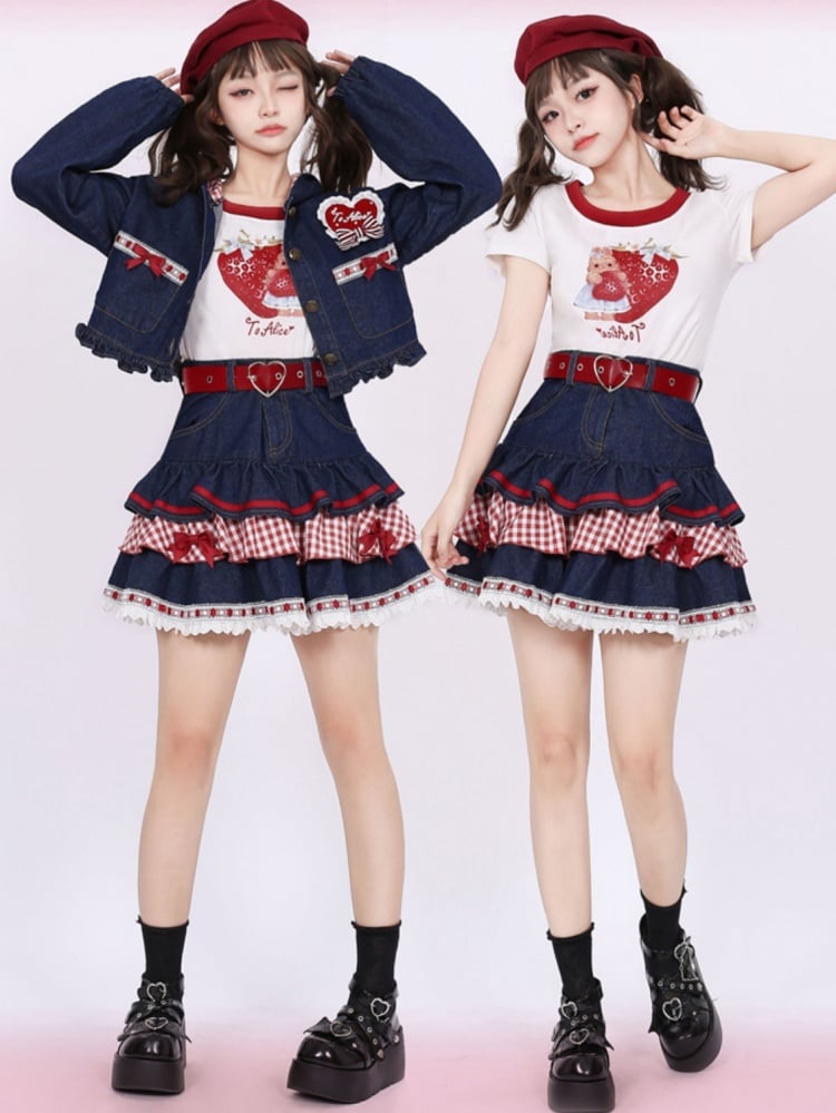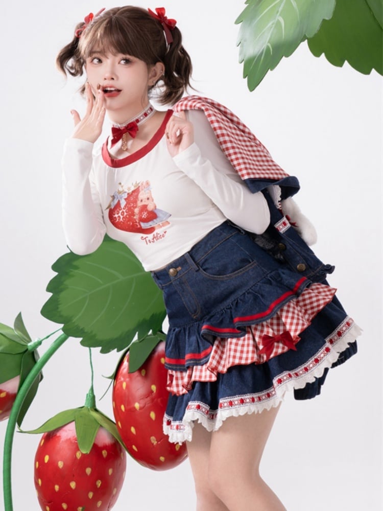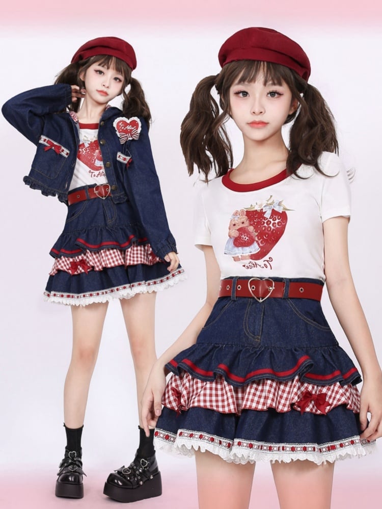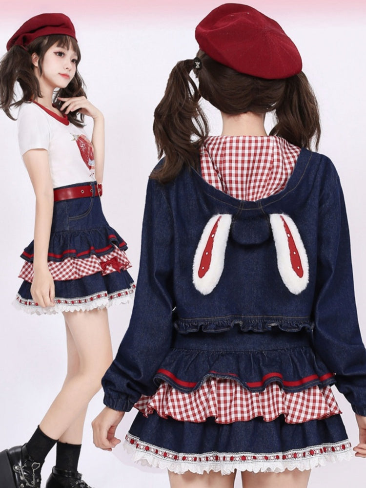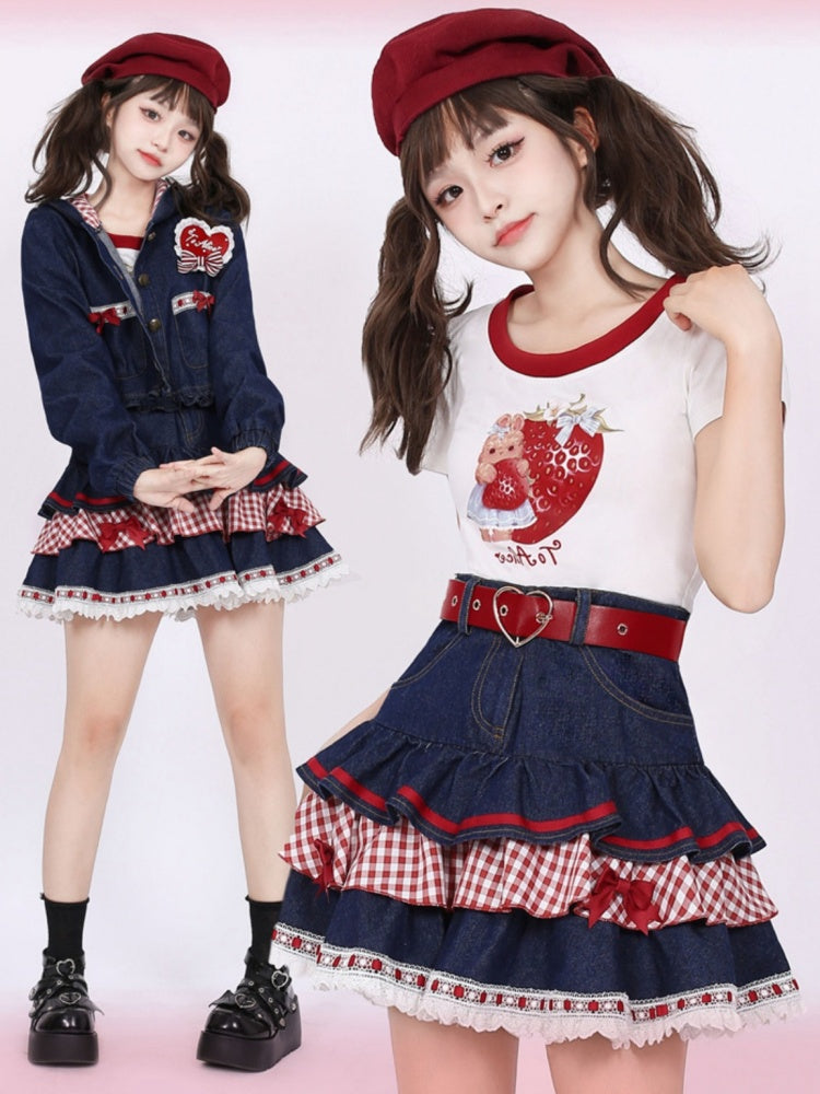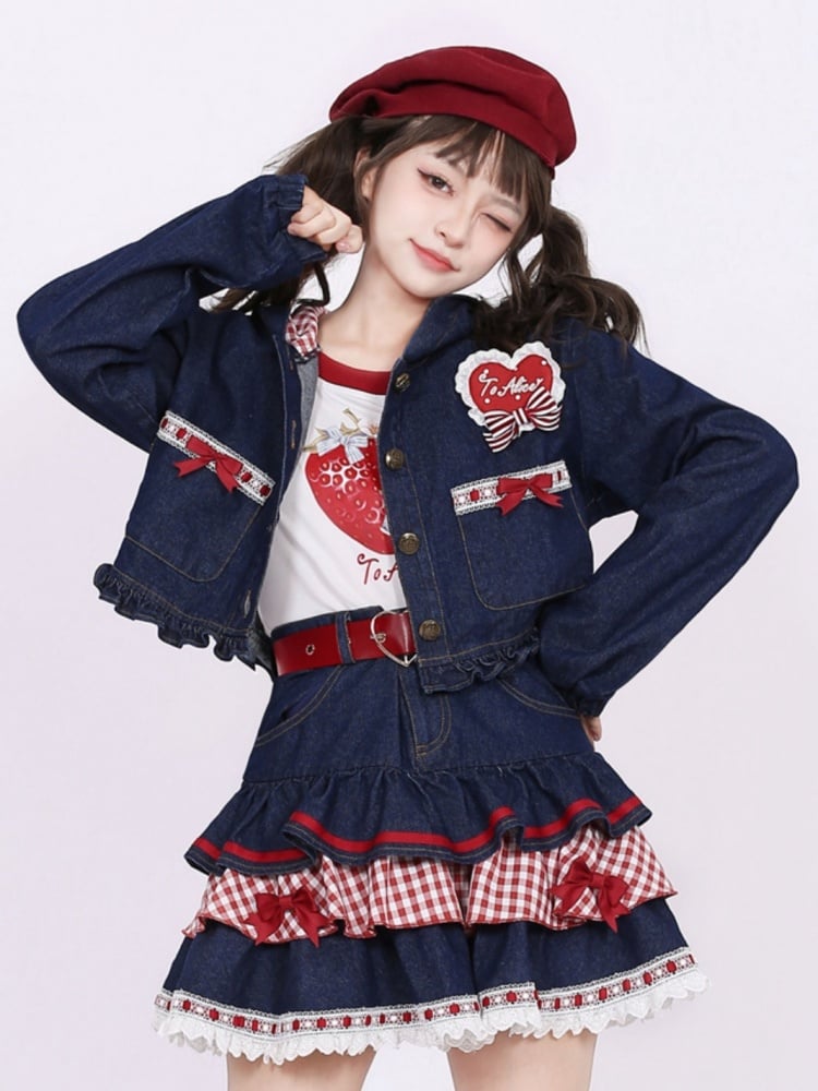 ネイビーブルーのレースヘムリボンアクセントのデニムティアードスカート、チェック柄パッチワーク