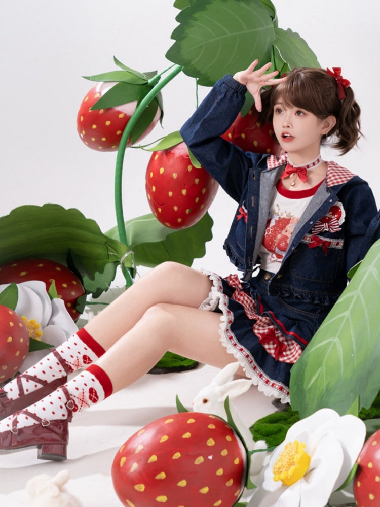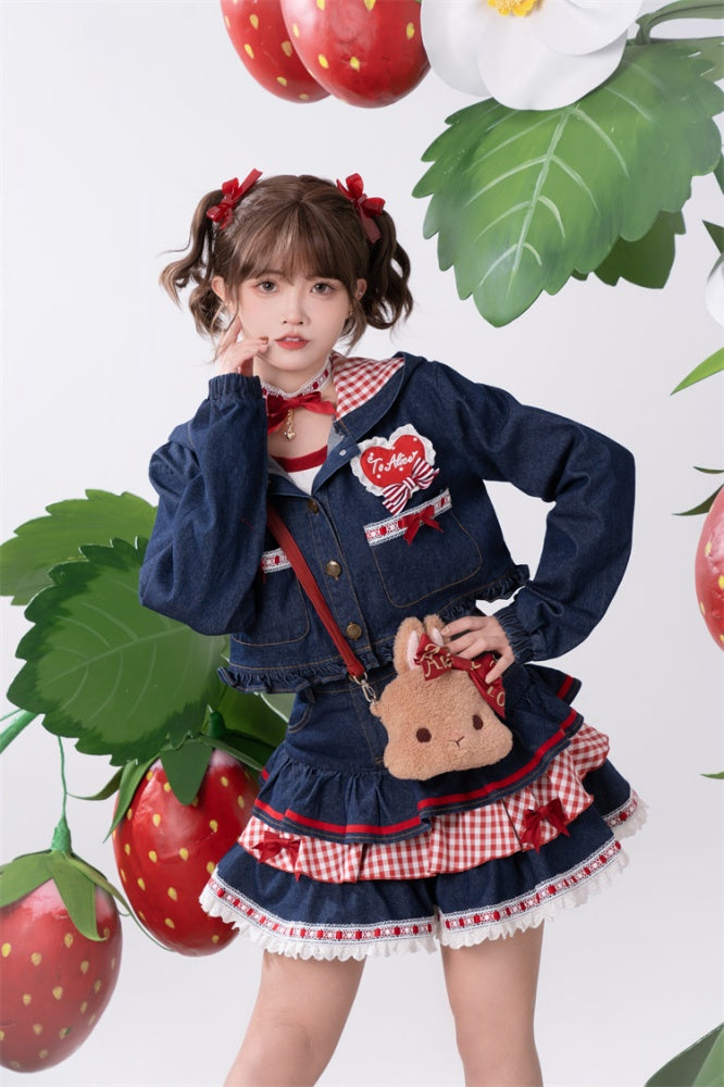 繊細なレースの裾とチャーミングなリボンがアクセントになった、愛らしいネイビーブルーのスカート。上品なデニム素材に、シックなチェック柄のパッチワークがアクセント。どんな装いにも可愛らしさをプラスしてくれます。