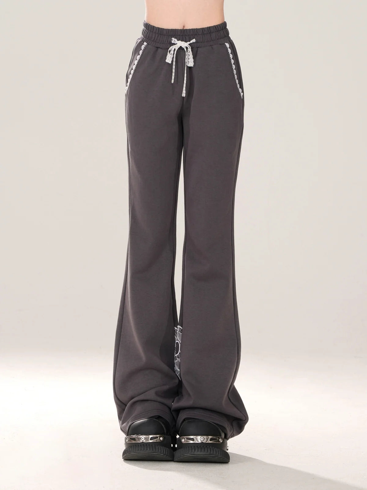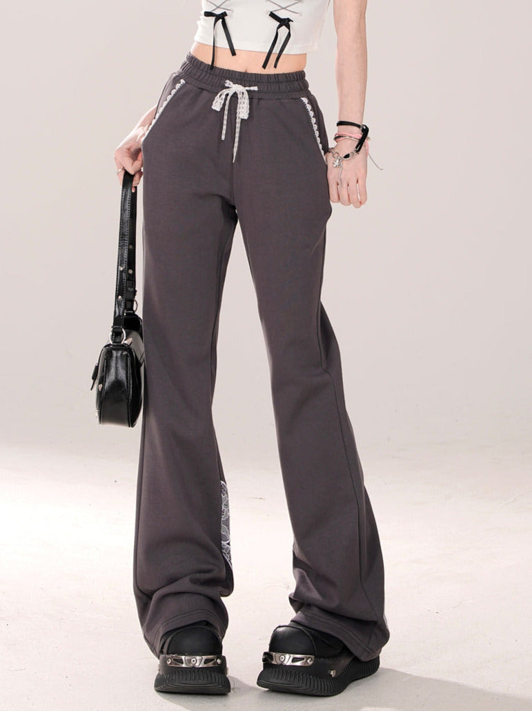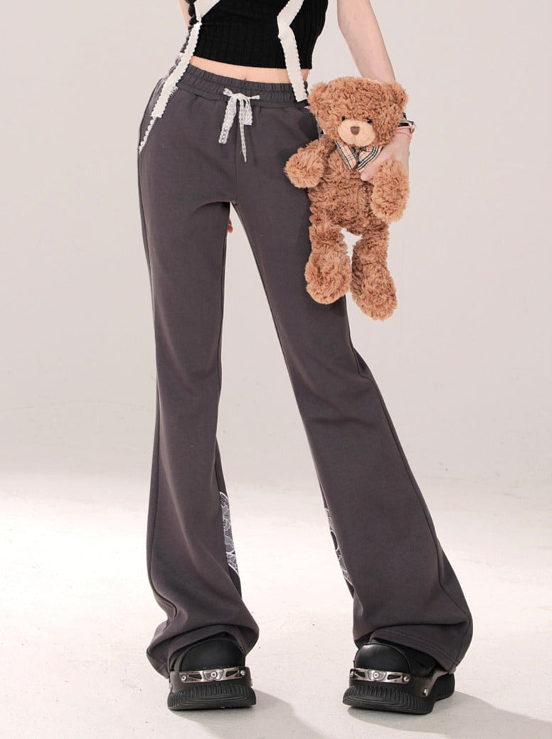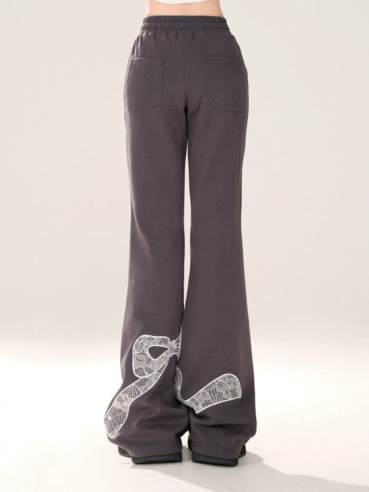 ニッチなレースデザインカジュアルグレーリボンパンツ