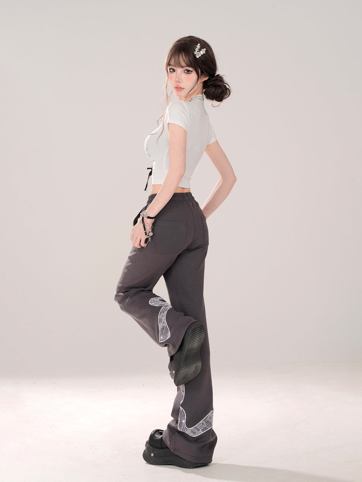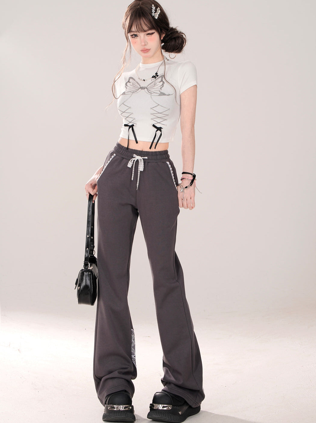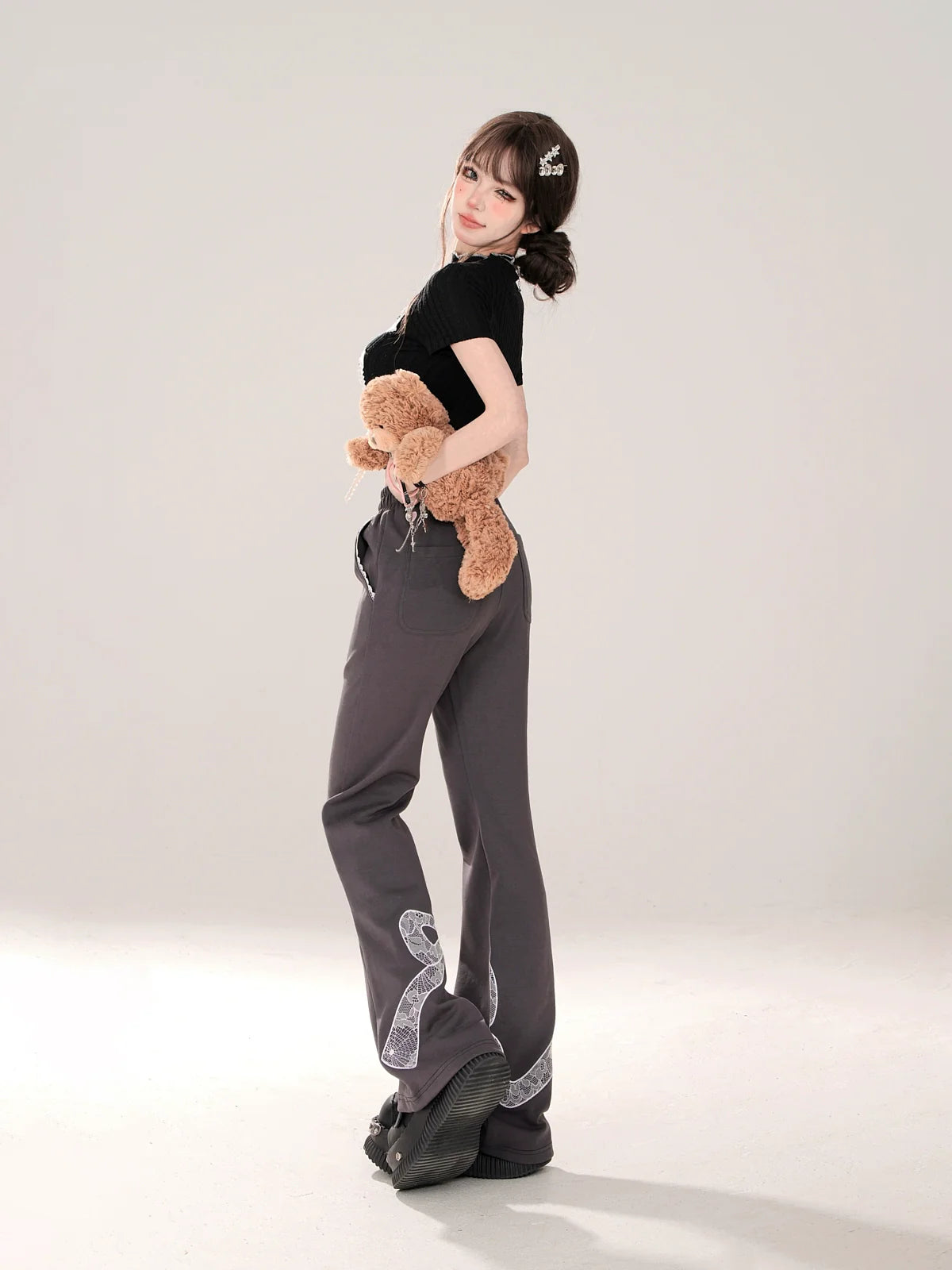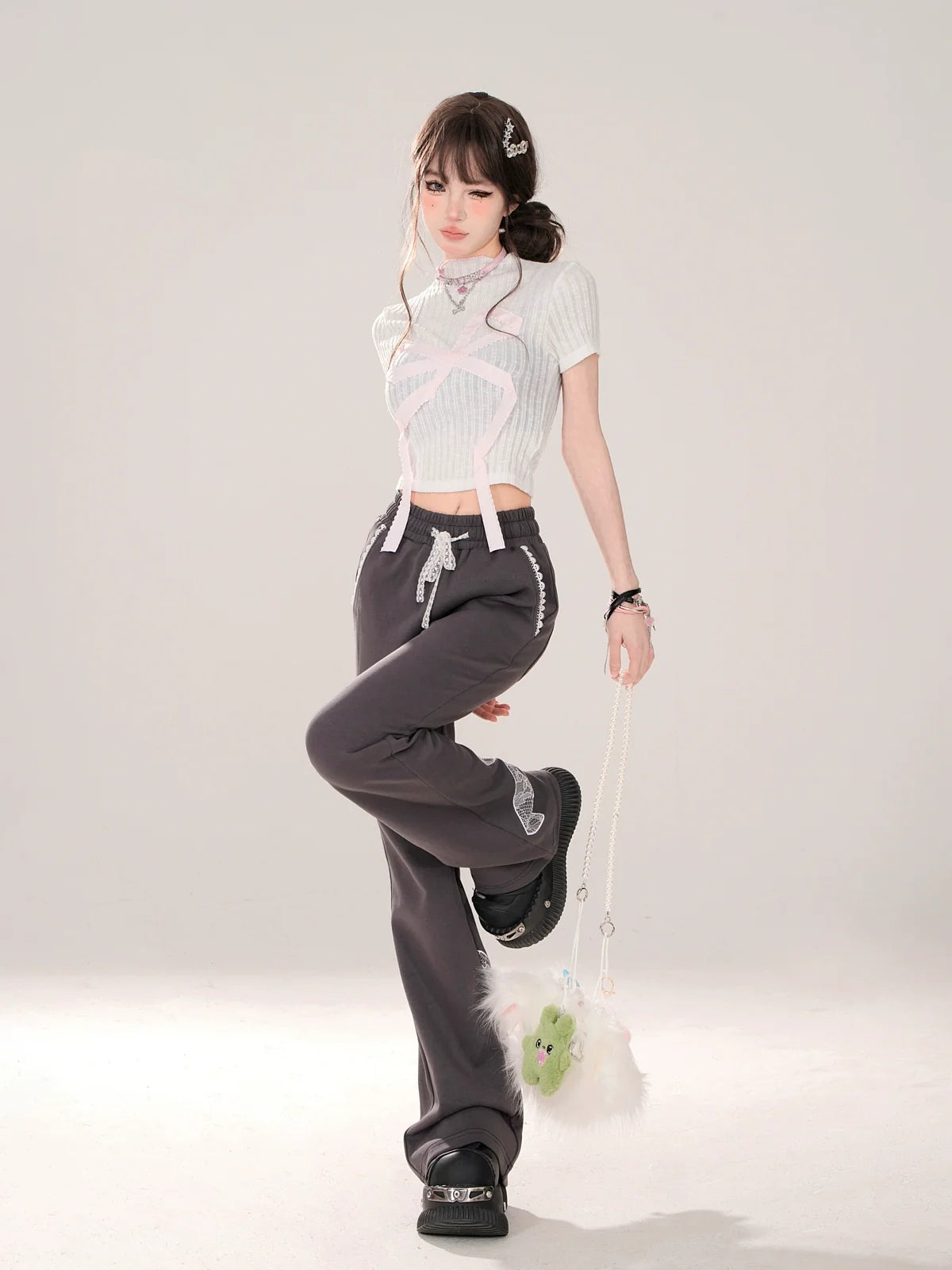 ニッチなレースデザインカジュアルグレーリボンパンツ