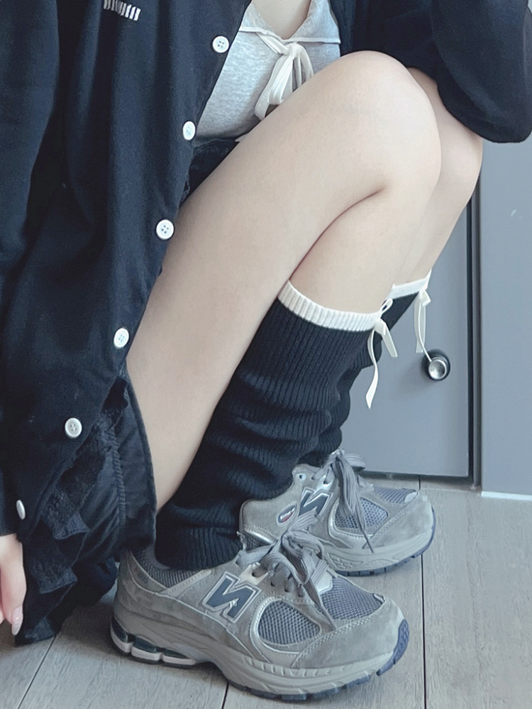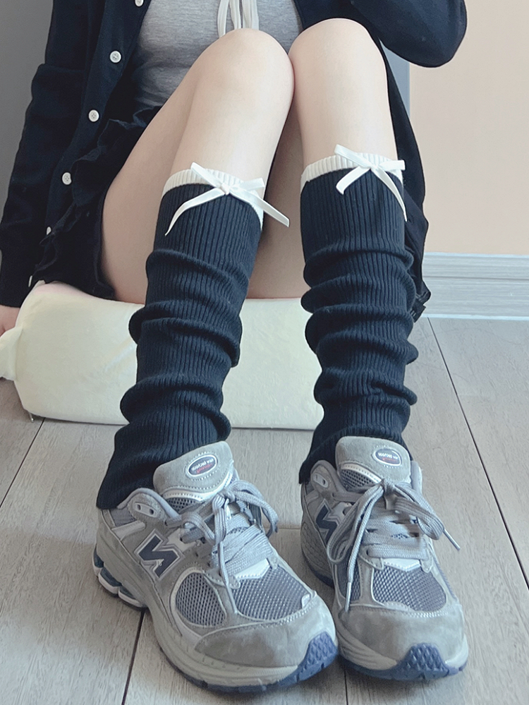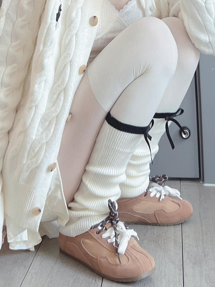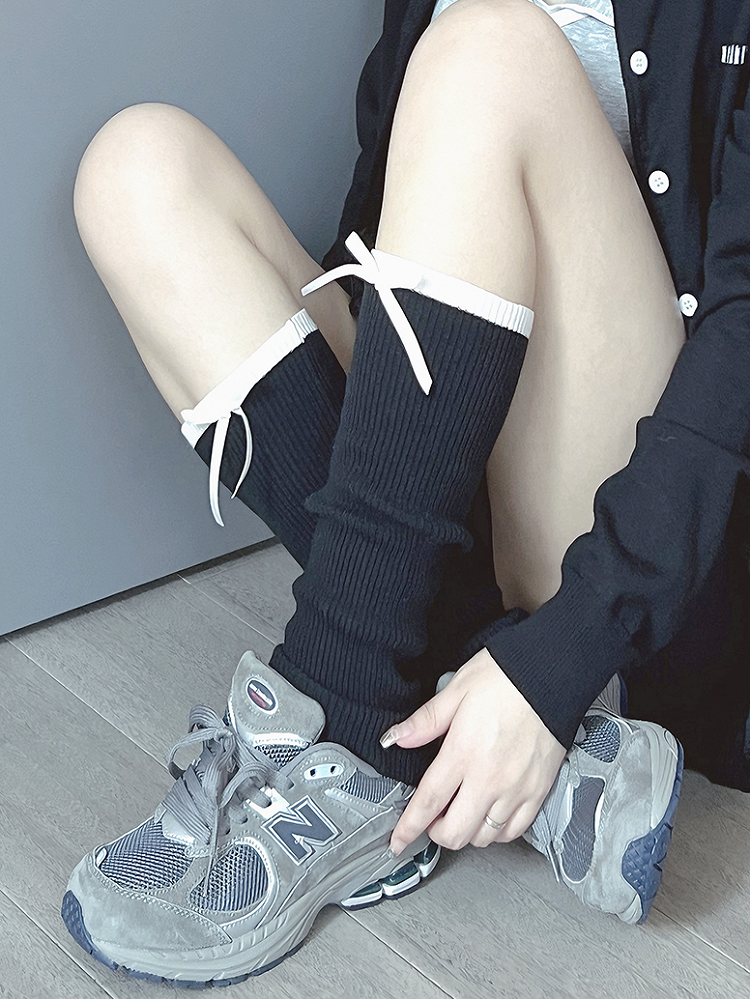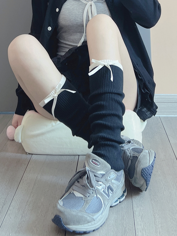 オフホワイト/ブラック スイート ボウノット レッグウォーマー