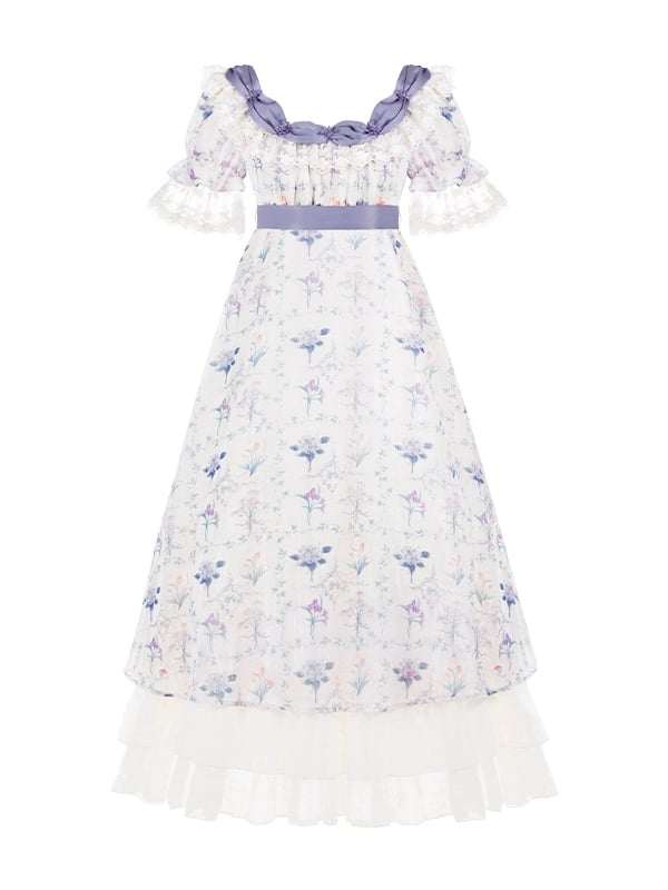 アイリスプリントエンパイアウエストロリータ花柄ドレススクエアネックラインエレガントワンピース