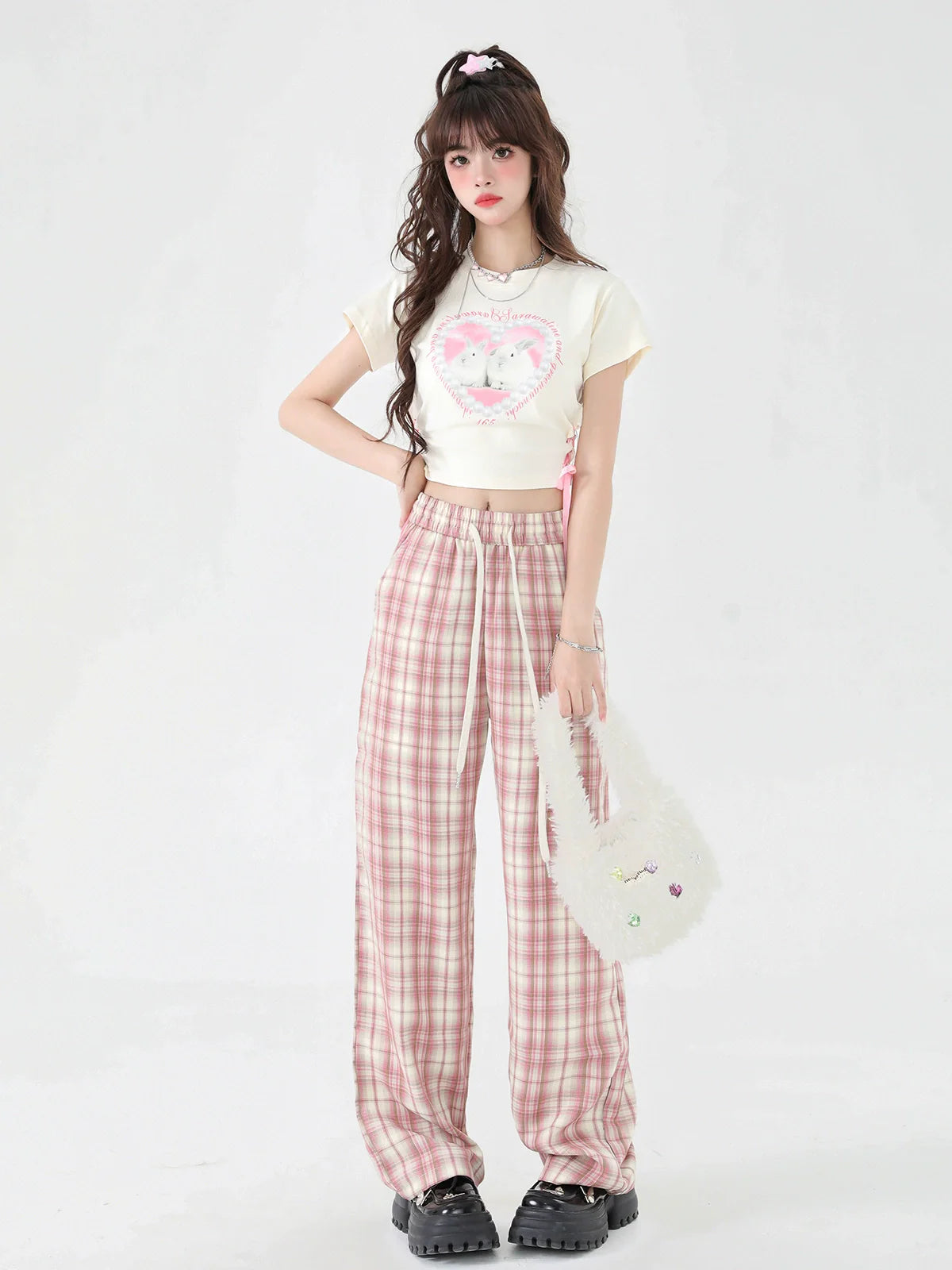 パンツ カジュアル チェック ピンク