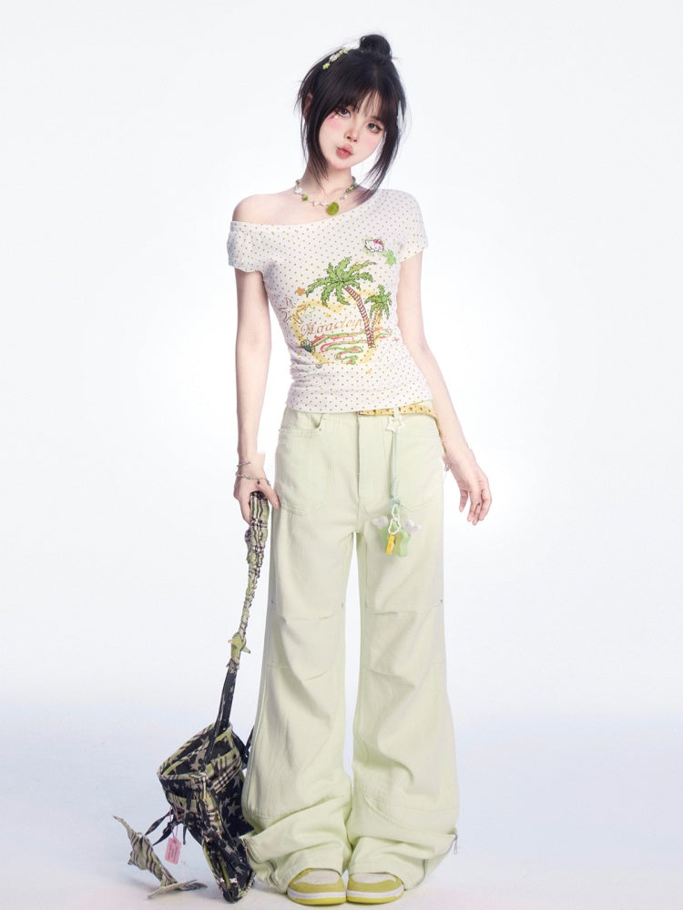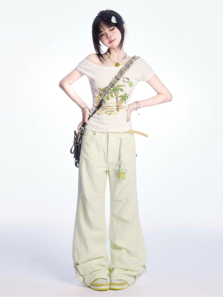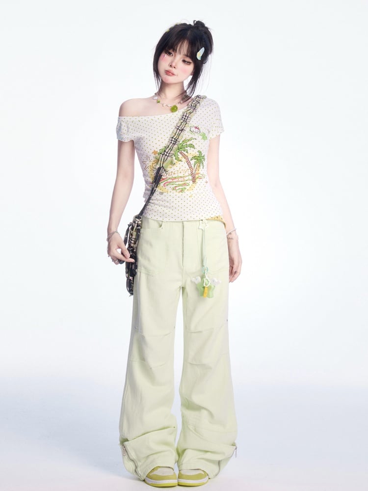 ライトグリーンのローウエスト、ジップカフス、ワイドレッグカーゴパンツ