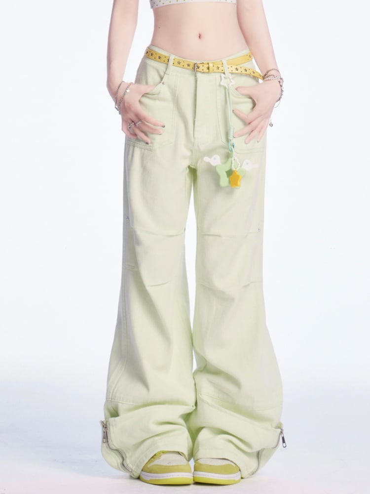 パンツ ライトグリーン ローウエスト ジップカフス ワイドレッグ カーゴ