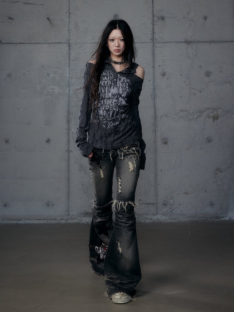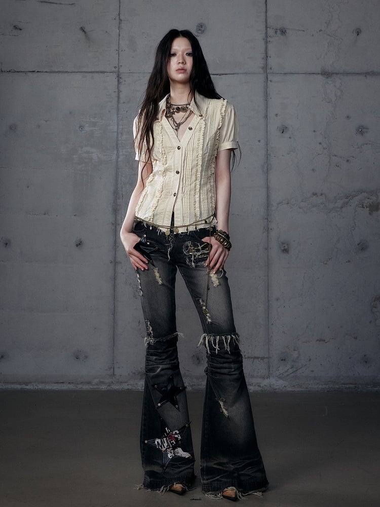 Wasteland Punk Rock Washed Black Flared Jeans with PU Star Patches & Raw Hem