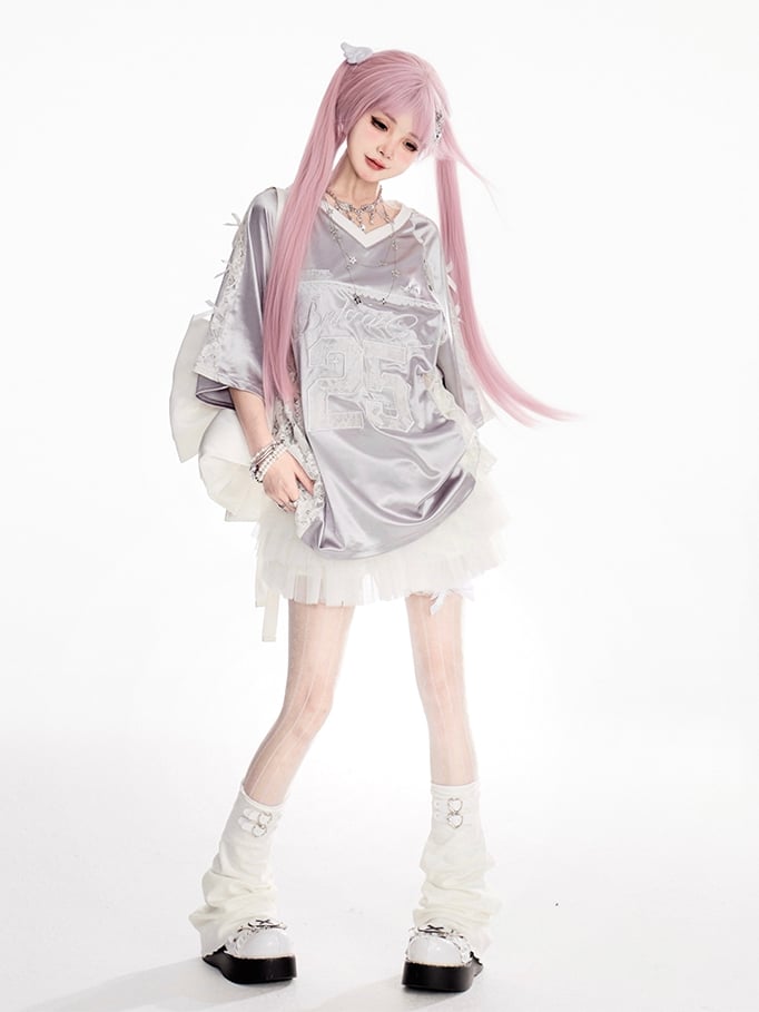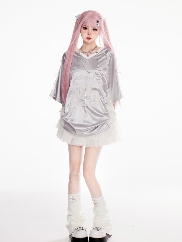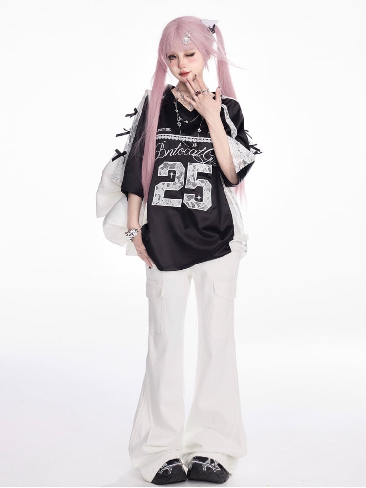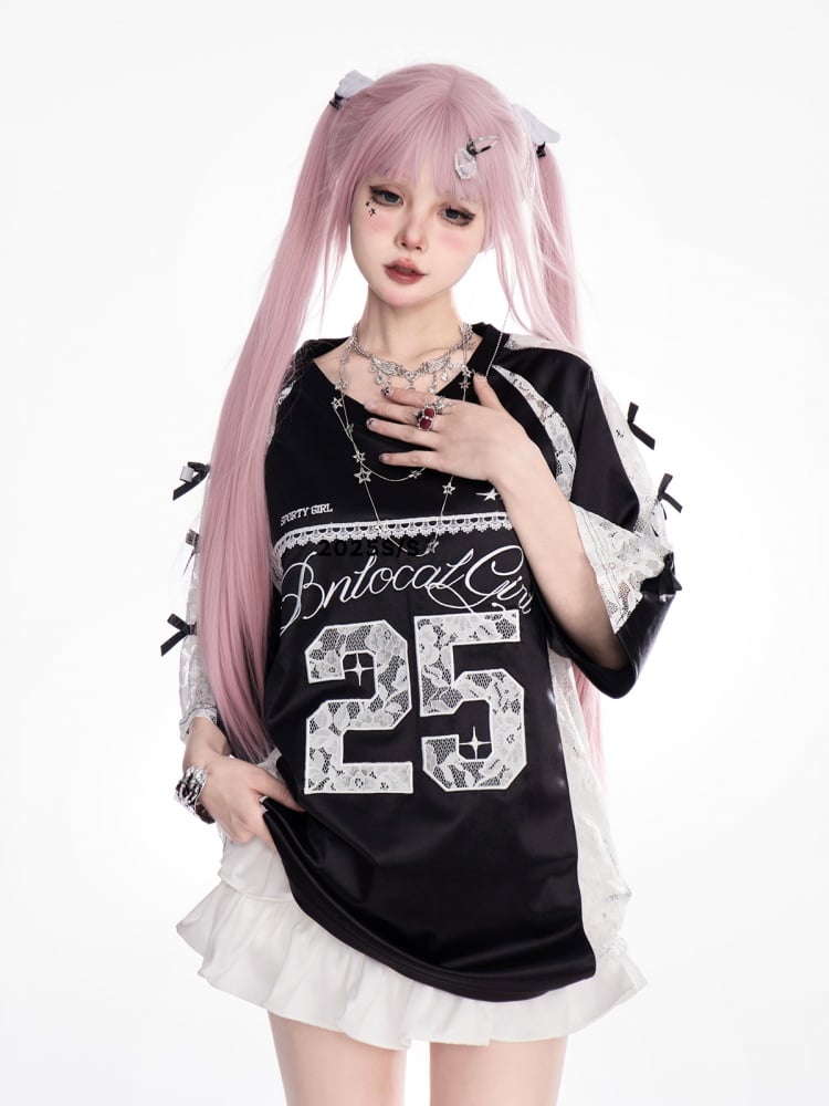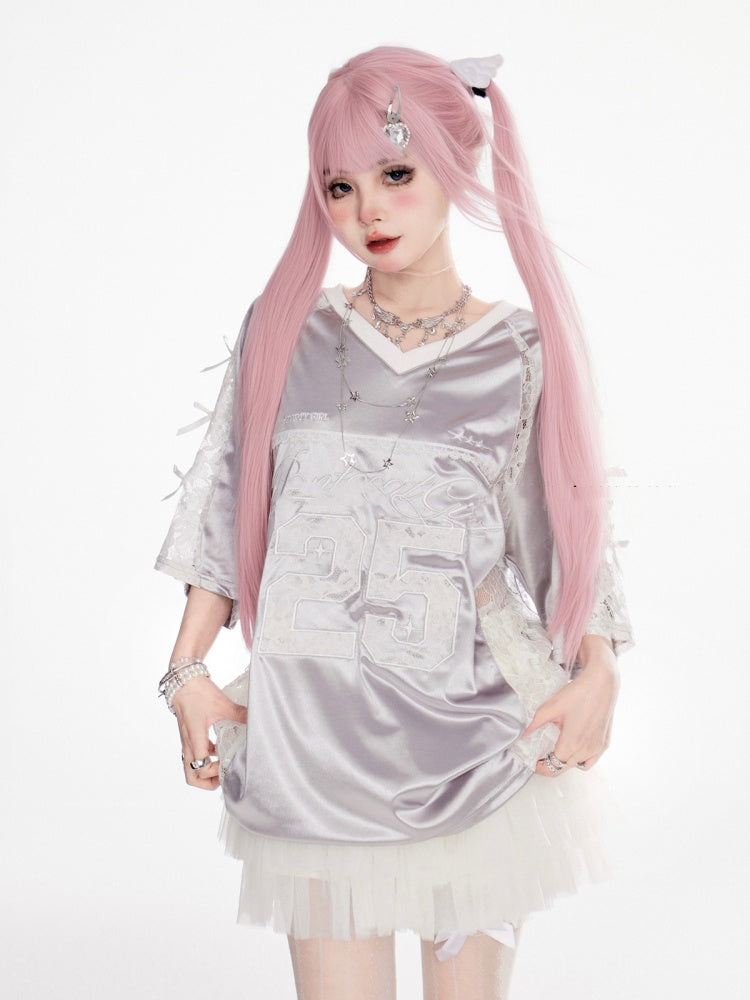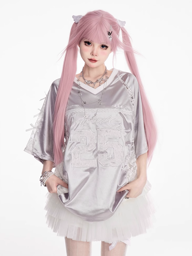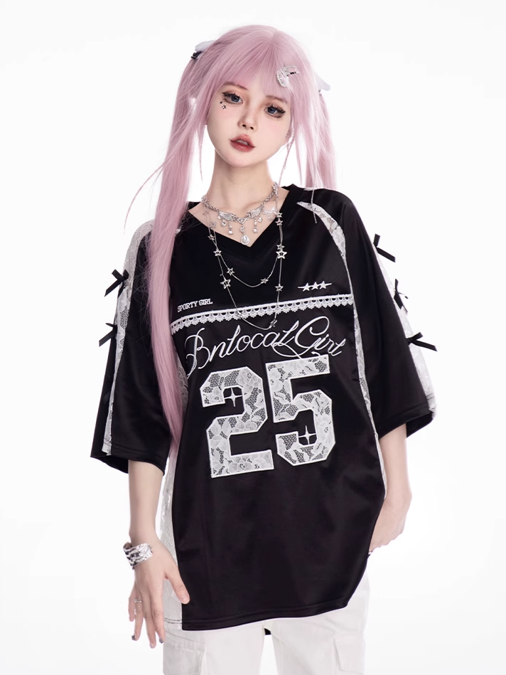 ブラック/シルバー Vネック コントラストレースパッチ ナンバーレースアップリケ サテンTシャツ
