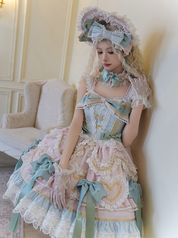 ピンクと白のオールドスクールロリータファッションドレス、蝶結びディテール、ロリータJSKセット