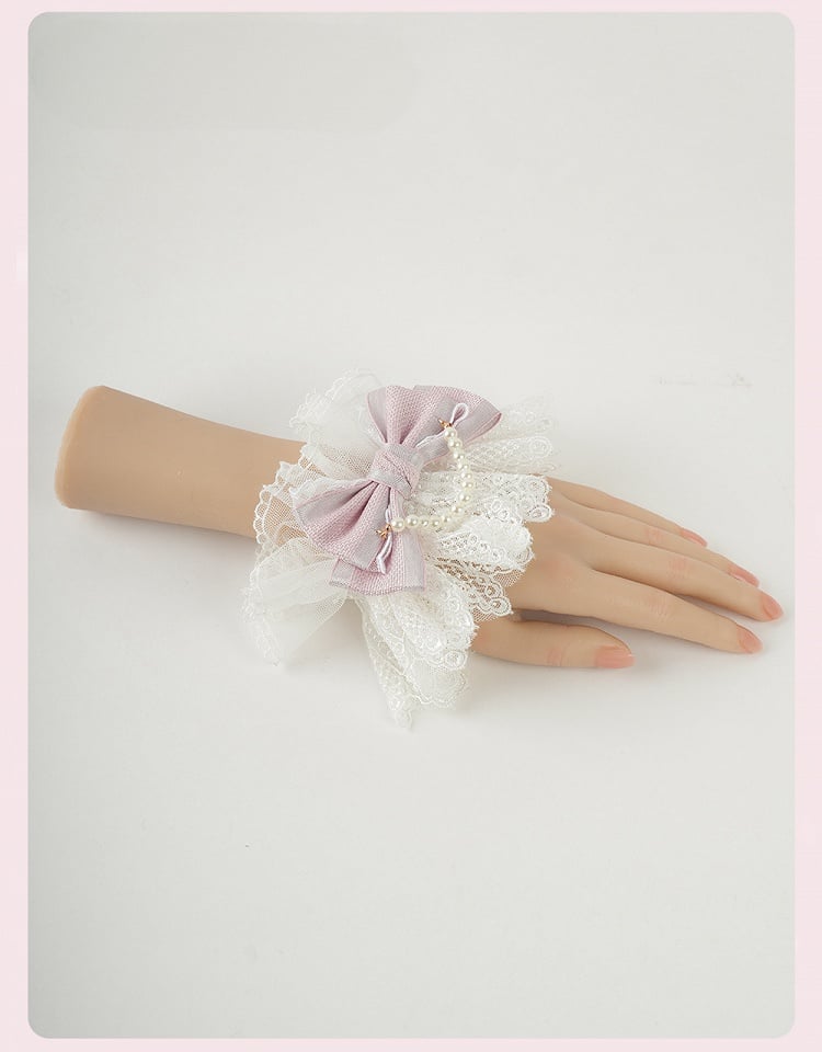 ピンクの大きなリボンとフリルのレーストリム、ビーズチェーン付きリストカフス