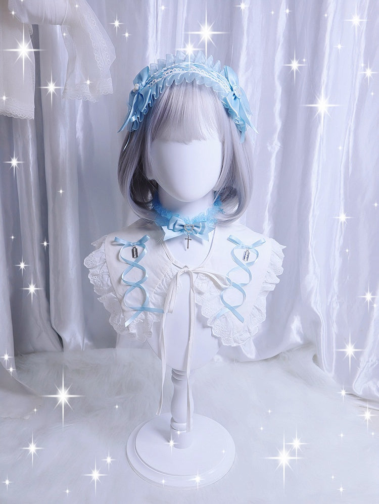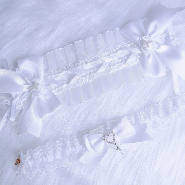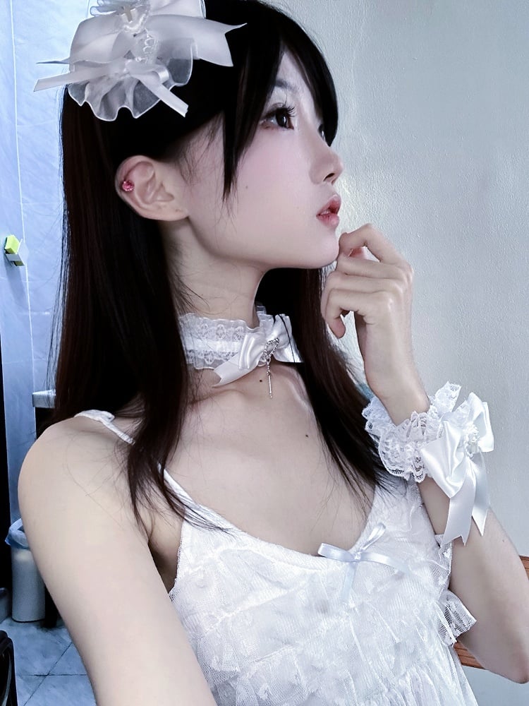 ピンク/ブルー/ホワイト ジライケイ クロス装飾レーストリム ちょう結びヘアバンド/ネックレス/リストカフ