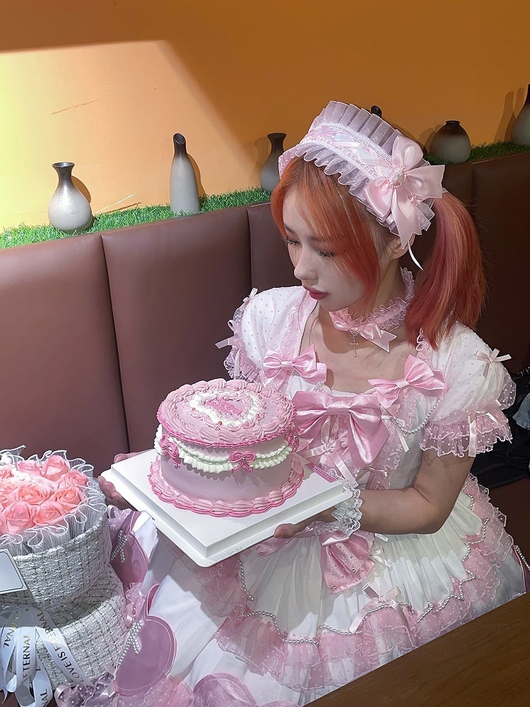 ピンクと白のオールドスクールロリータファッションドレス、蝶結びディテール、ロリータJSKセット
