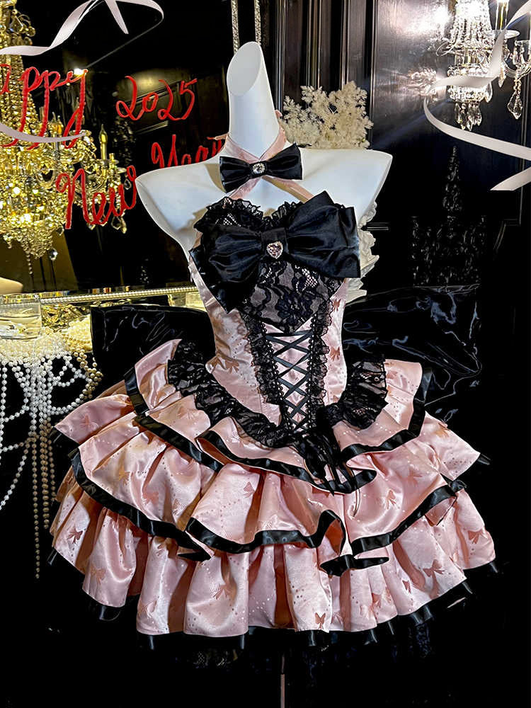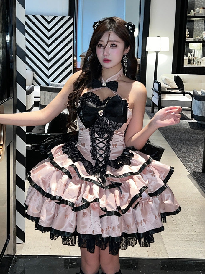 ピンクの蝶結び生地のティアードパフィースカート、ホルターネック、バースデーコルセットドレス