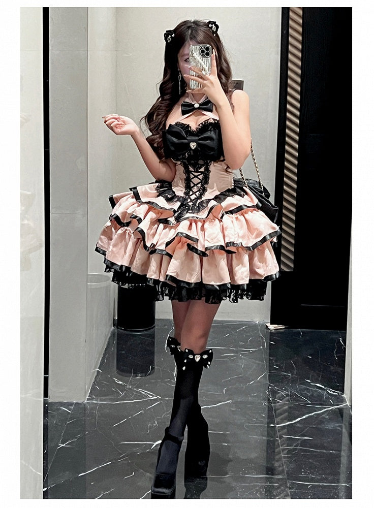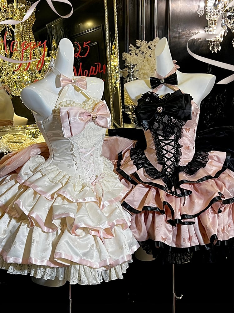 ピンクと白のオールドスクールロリータファッションドレス、蝶結びディテール、ロリータJSKセット
