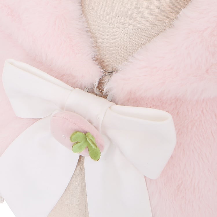 ストロベリーリボンとピンクのうさぎ耳がデザインされた、遊び心あふれるフード付きケープ。フードには愛らしいピンクのうさぎ耳をあしらった、魅力的なケープです。ケープ全体には、甘美なストロベリーリボンがあしらわれ、縁取りの繊細なレースのトリムが美しく映えます。とびきり柔らかなプラッシュ素材を使用し、暖かさとスタイリッシュさを両立しています。