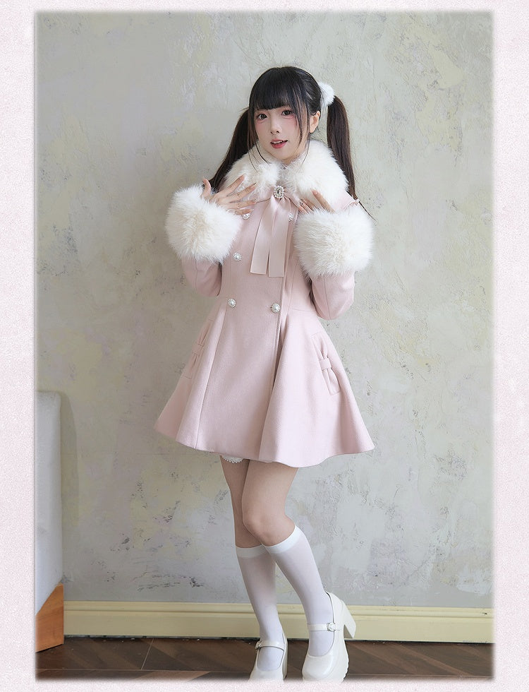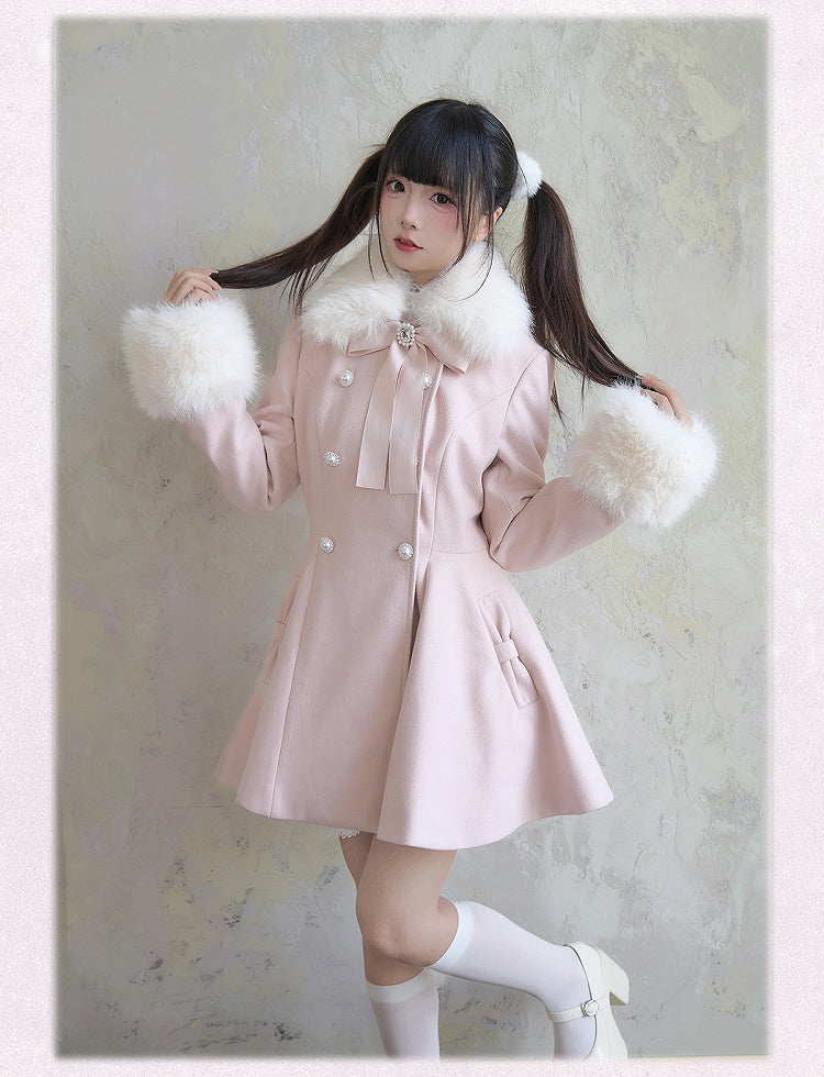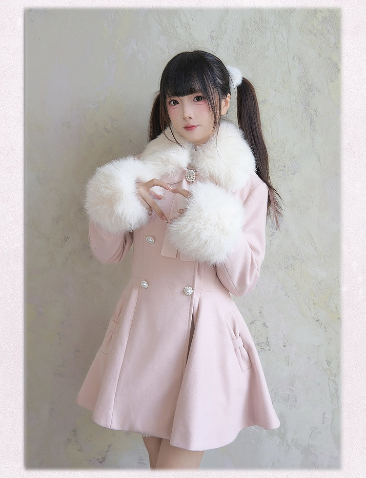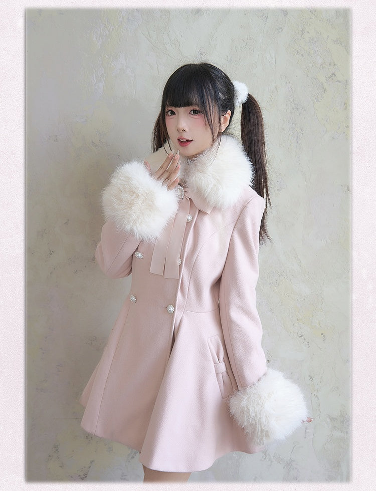 取り外し可能なジライケイのピンクのコート、大きなリボン、ふわふわの襟と袖口、ラインストーンのダブルブレスト