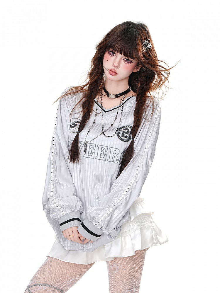 ピンク/グレーのストライプ柄Vネックルーズスウェットシャツ