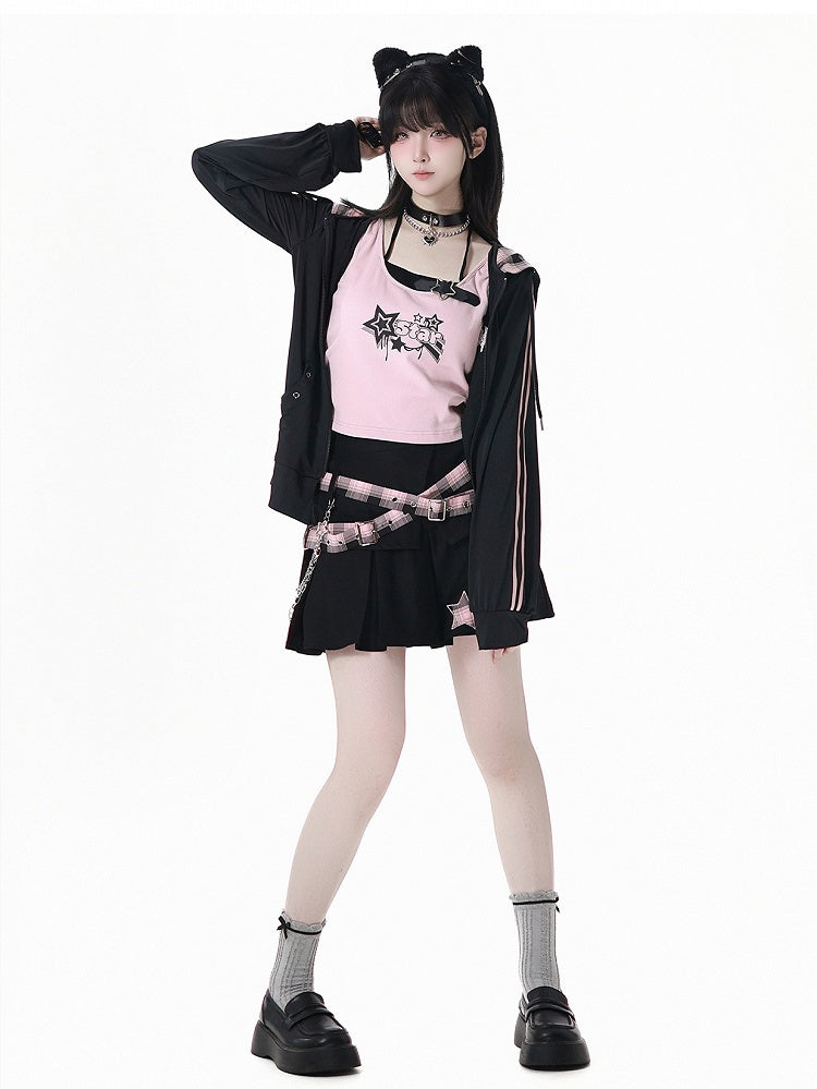 ピンクのチェック柄フード付きブラックスター刺繍サンプロテクションジャケット