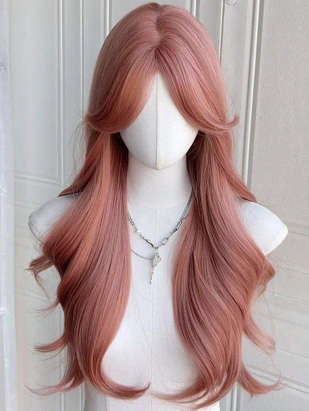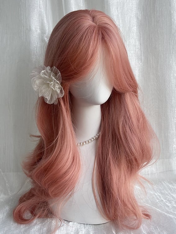 ピンクのウエスト丈ウェーブ合成ウィッグ(カーテンバング付き)