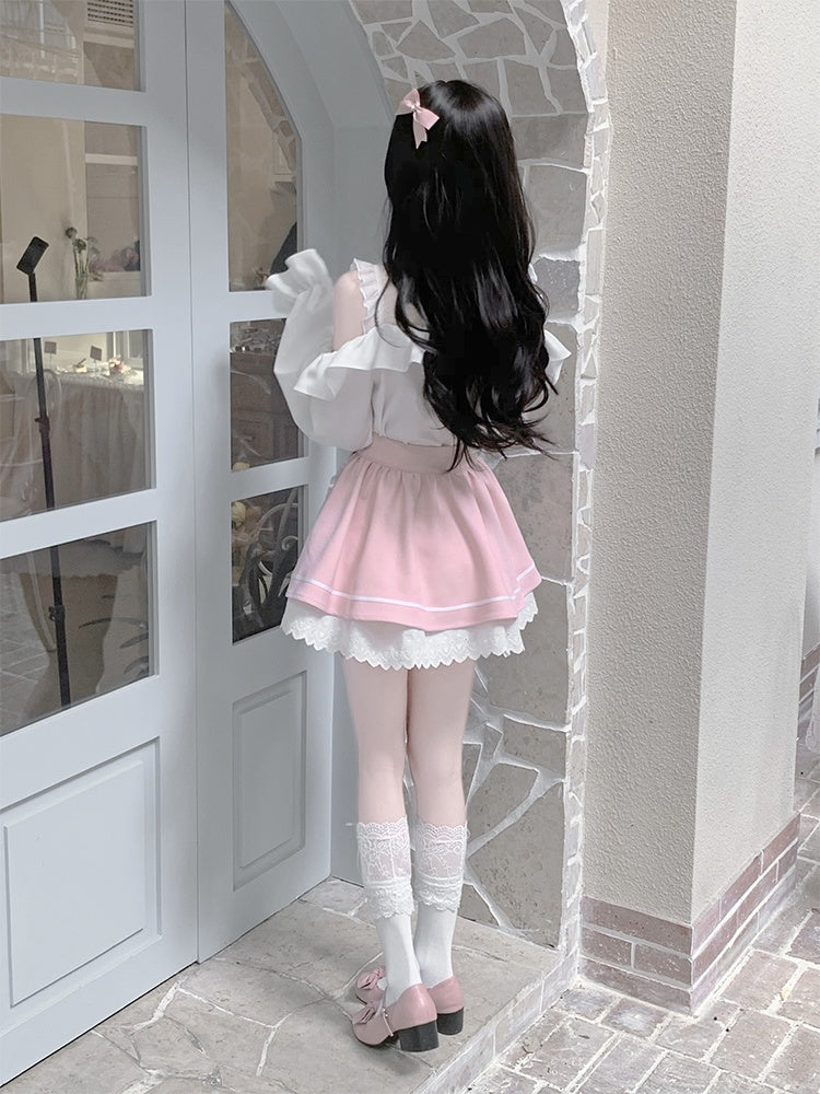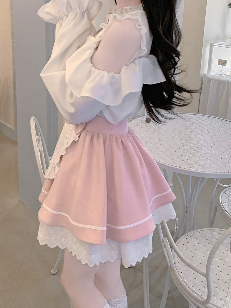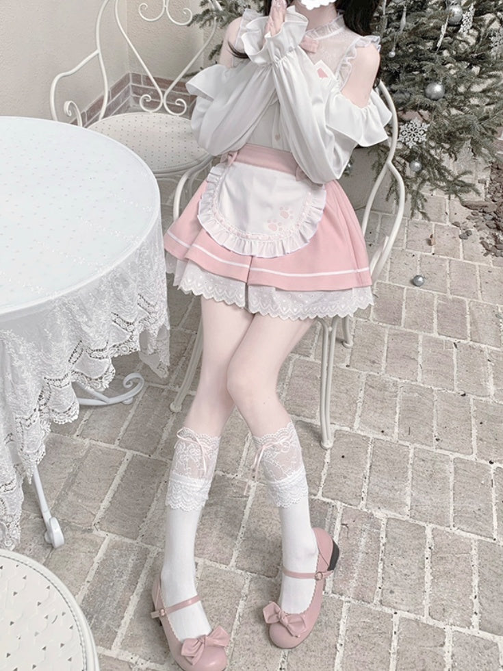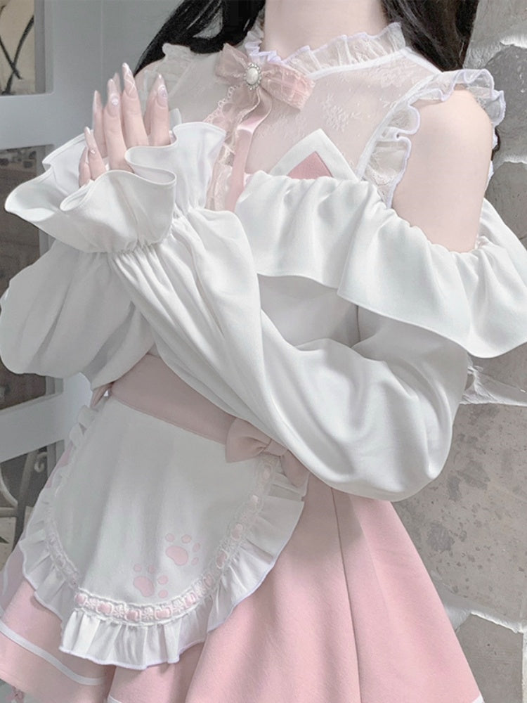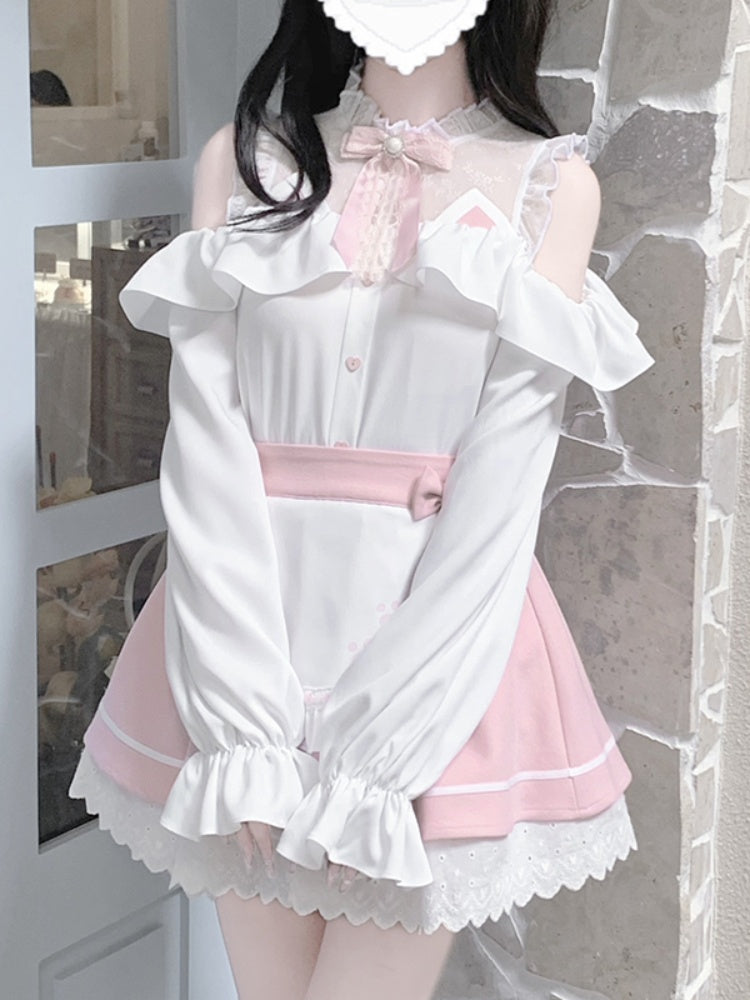 ピンク&ホワイトのジライケイ フルセット - イリュージョンネックライン カットアウトショルダートップ + エプロンデザインスカート + 蝶ネクタイ