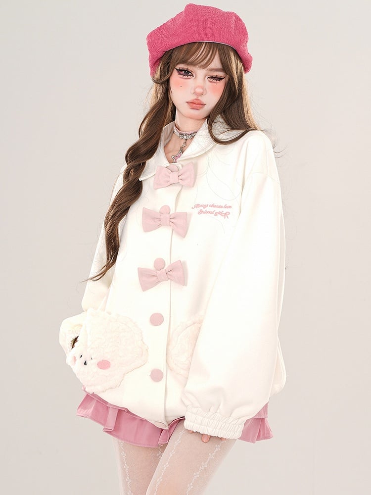 ピンク/ホワイトのプラッシュパピーポケット付きポロカラージャケット