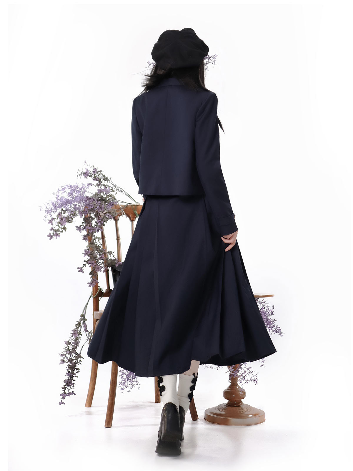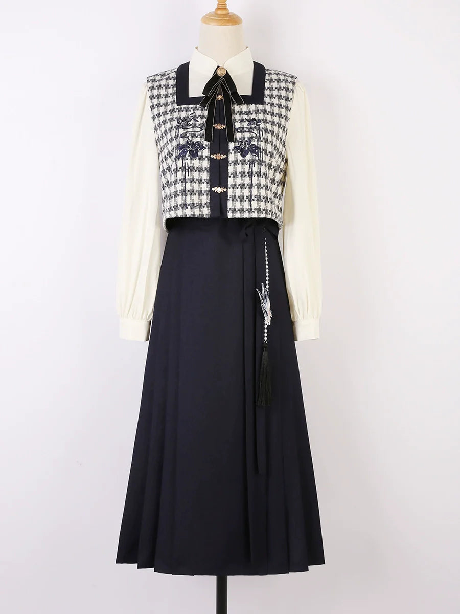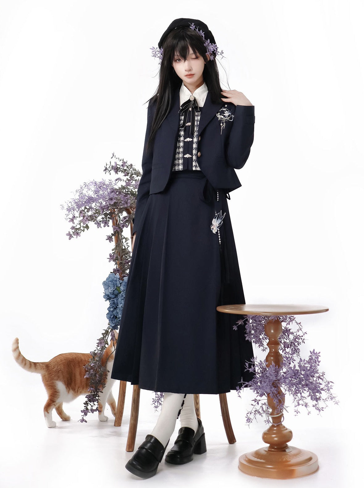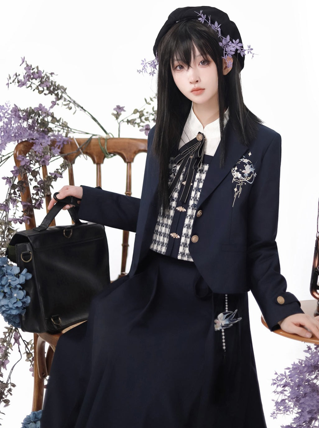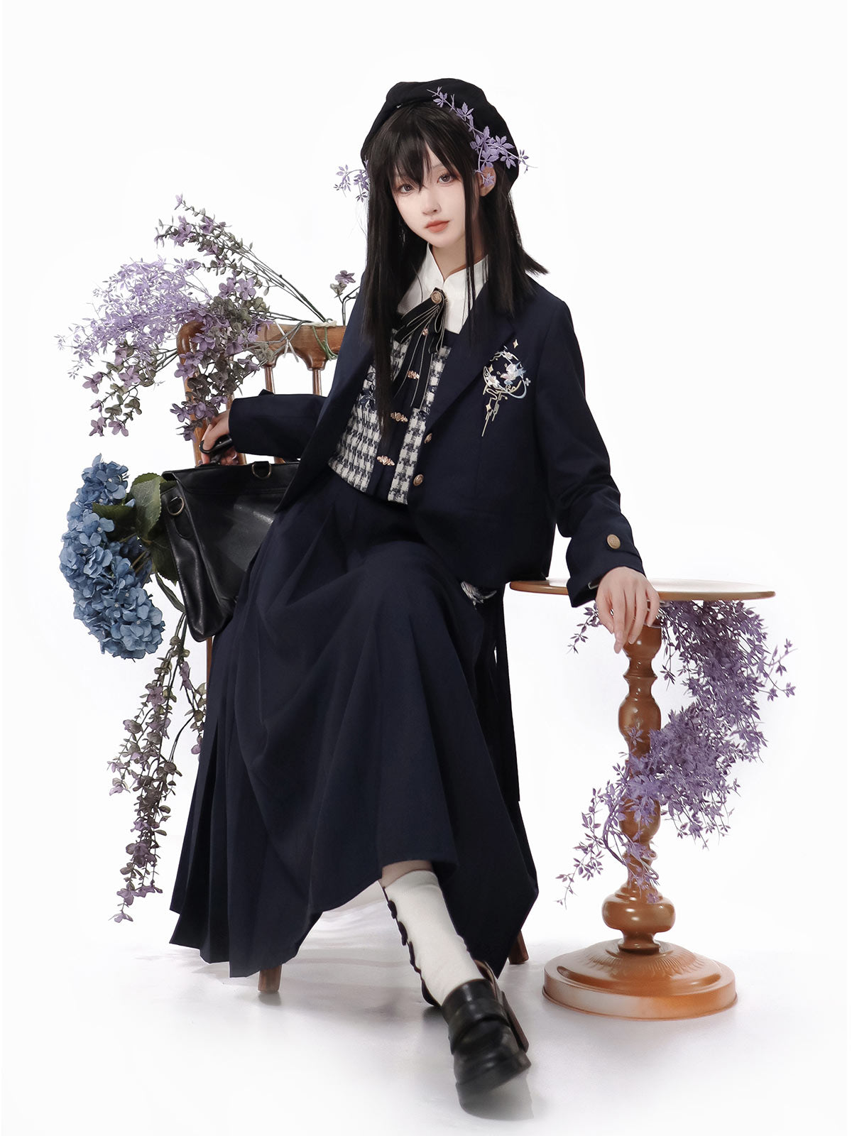 プリーツスカート バックルブラウス カレッジチャイナベスト ジャケット チェック