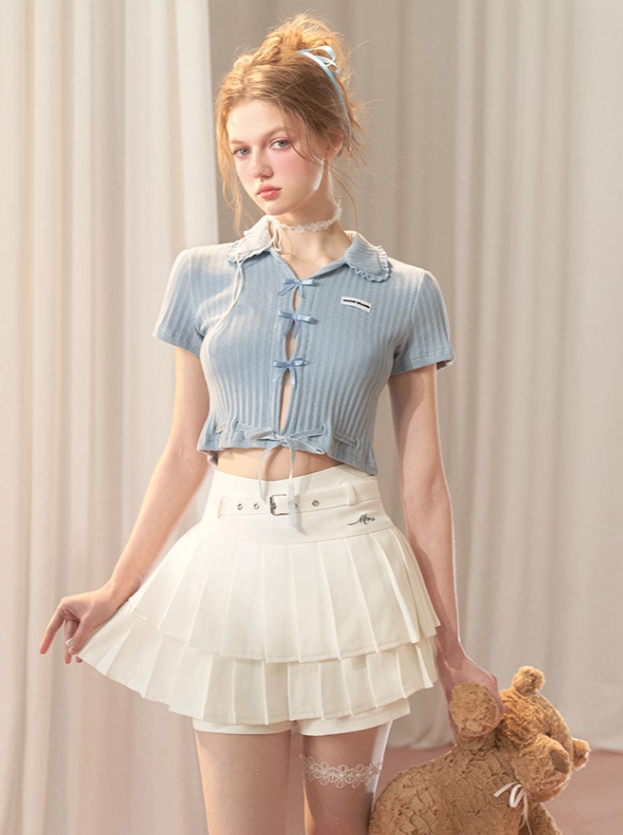 青と白のオールドスクールロリータファッションドレス 蝶結びディテール JSK セット