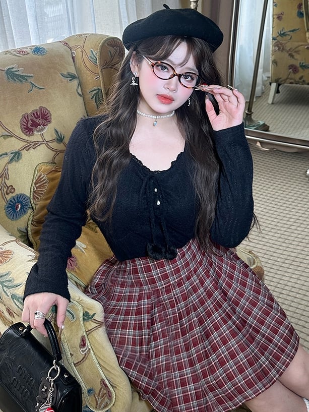 キュートなプラスサイズのブラックレーストップス。美しいVネック、長袖、そしてチャーミングなポンポンのアクセントが魅力です。着心地が良く、目を引くこのトップスで、可愛らしく自信に満ちた装いを演出しましょう。
