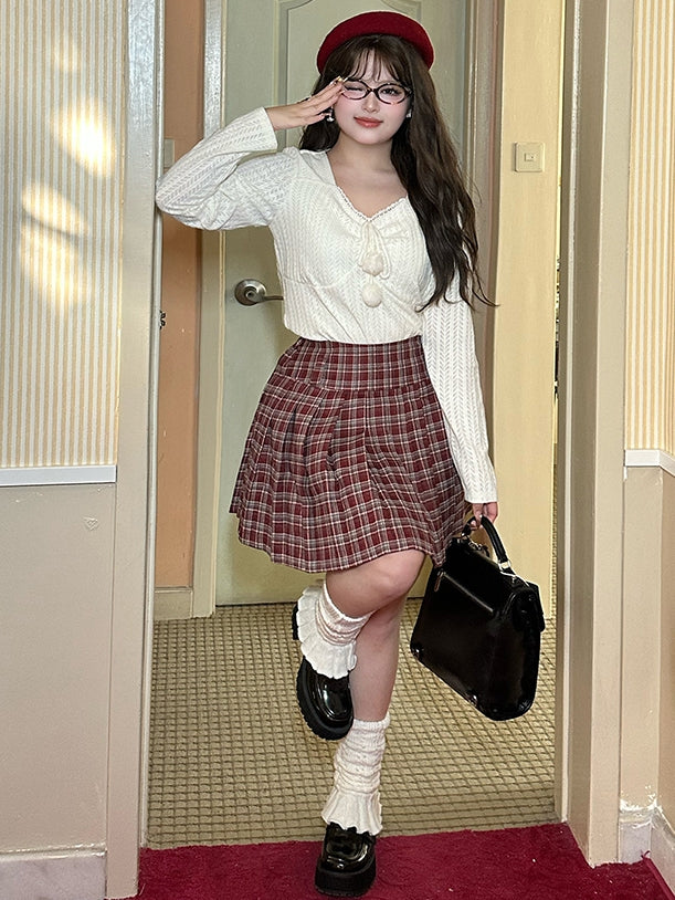 プラスサイズ ホワイト ポンポン アクセント Vネック 長袖 レース トップス