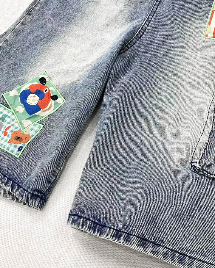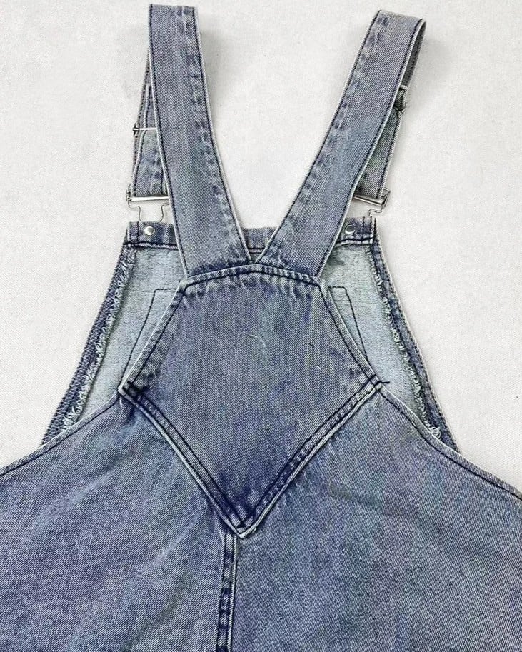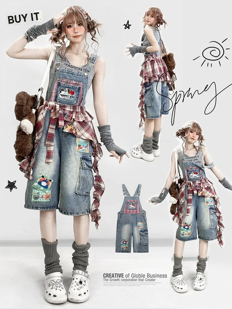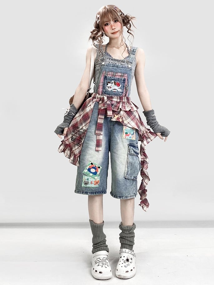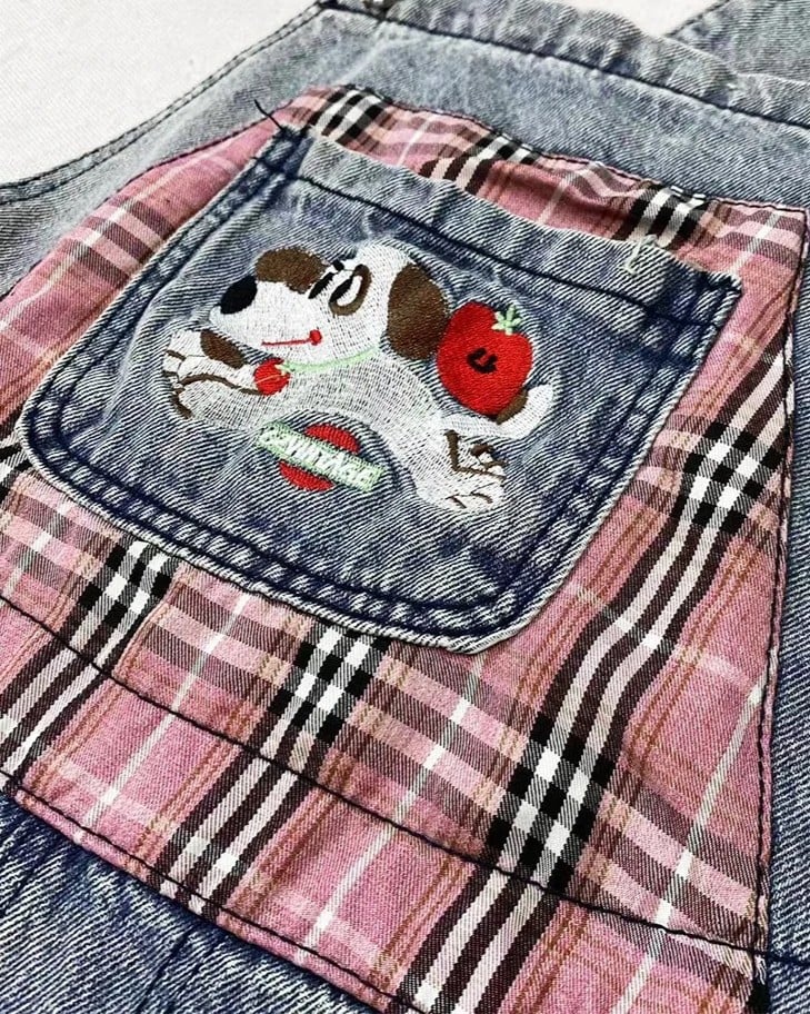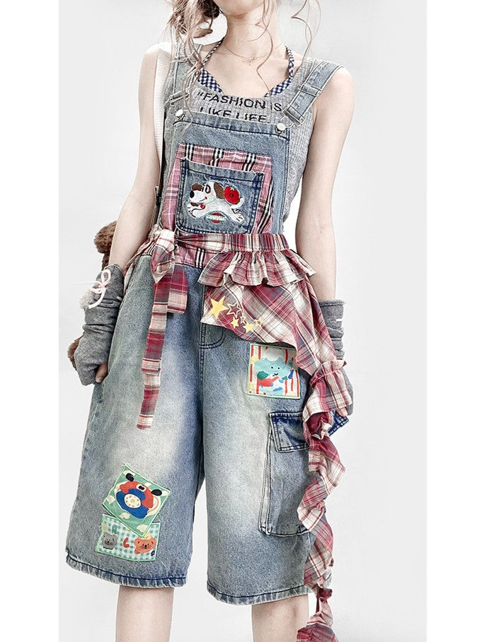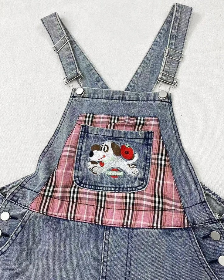チェック柄ウエストアクセサリー付き、キュートな子犬のポケット付きサマーオーバーオールジーンズ
